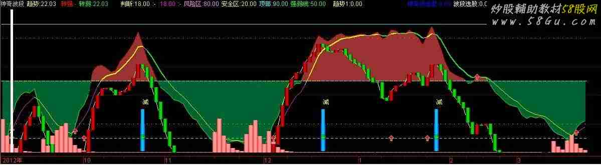 趋势:SMA(((CLOSE-LLV(LOW,28))/(HHV(HIGH,28)-LLV(LOW,28))*100),3,1),COLORYELLOW; DRAWBAND(趋势,RGB(155,50,50),50,RGB(0,100,50)); {STICKLINE(趋势>50,趋势,50,6,0),COLORFF00FF; STICKLINE(趋势<50,趋势,50,6,0),COLORGREEN;} 转强:IF(趋势>50,趋势,DRAWNULL),COLOR0000FF; 转弱:IF(趋势<50,趋势,DRAWNULL),COLORGREEN; RSV:=(CLOSE-LLV(CLOSE,9))/(HHV(CLOSE,9)-LLV(CLOSE,9))*100; K:=SMA(RSV,3,1); D:=SMA(K,3,1); TYP:=(HIGH+LOW+CLOSE)/3; CCI:=(TYP-MA(TYP,14))/(0.015*AVEDEV(TYP,14)); DIFF:=EMA(CLOSE,2)-EMA(CLOSE,55); DEA:=EMA(DIFF,6); MACD:=2*(DIFF-DEA); 转点:=IF(K>D AND CCI>0 AND DIFF>DEA AND MACD>0,1,0); STICKLINE(转点=1,50,50,2,0),COLORYELLOW; STICKLINE(转点=0,50,50,2,0),COLORCYAN; STICKLINE(C,90,90,1,0),COLORYELLOW; STICKLINE(C,10,10,1,0),COLORCYAN; 判断:SMA(趋势,3,1),COLORYELLOW; IF(判断>50 AND 趋势>判断,判断,DRAWNULL ),COLORYELLOW,LINETHICK2; IF(判断<50 AND 趋势>判断,判断,DRAWNULL),COLORFF00FF; IF(判断>50 AND 趋势<判断,判断,DRAWNULL),COLORGREEN,LINETHICK2; 风险区:80,COLORFF85FF,POINTDOT; 安全区:20,COLORYELLOW,POINTDOT; 顶部:90,COLORFFFF00; 强弱线:50,COLORGREEN,POINTDOT; DRAWICON(CROSS(趋势,判断) AND 趋势<80 ,判断,1); DRAWICON(CROSS(趋势,顶部),顶部,2); LC:= REF(CLOSE,1); RSI:=SMA(MAX(CLOSE-LC,0),6,1)/SMA(ABS(CLOSE-LC),6,1)*100; VAR1:=(HHV(HIGH,9)-CLOSE)/(HHV(HIGH,9)-LLV(LOW,9))*100-70; VAR2:=SMA(VAR1,9,1)+100; VAR3:=(CLOSE-LLV(LOW,9))/(HHV(HIGH,9)-LLV(LOW,9))*100; VAR4:=SMA(VAR3,3,1); VAR5:=SMA(VAR4,3,1)+100; VAR6:=VAR5-VAR2; 趋势1: IF(VAR6>45,VAR6-45,0),COLOR00FFFF; VAR2Q:=REF(LOW,1); VAR3Q:=SMA(ABS(LOW-VAR2Q),3,1)/SMA(MAX(LOW-VAR2Q,0),3,1)*100; VAR4Q:=EMA(IF(CLOSE*1.3,VAR3Q*10,VAR3Q/10),3); VAR5Q:=LLV(LOW,30); VAR6Q:=HHV(VAR4Q,30); VAR7Q:=IF(MA(CLOSE,58),1,0); VAR8Q:=EMA(IF(LOW<=VAR5Q,(VAR4Q+VAR6Q*2)/2,0),3)/999*VAR7Q; 火焰山:=IF(VAR8Q>100,100,VAR8Q); STICKLINE(火焰山>0,0 ,火焰山*1.2,3,0 ),COLOR4444FF; STICKLINE(火焰山>0,0 ,火焰山*1.2,2,0 ),COLOR7777FF; STICKLINE(火焰山>0,0 ,火焰山*1.2,1,0 ),COLOR9999FF; STICKLINE(REF(趋势1,1)< 趋势1, 趋势1,REF(趋势1,1),3,0),COLOR000033; STICKLINE(REF(趋势1,1)< 趋势1, 趋势1,REF(趋势1,1),2,0),COLOR000077; STICKLINE(REF(趋势1,1)< 趋势1, 趋势1,REF(趋势1,1),1.5,0),COLOR0000BB; STICKLINE(REF(趋势1,1)< 趋势1, 趋势1,REF(趋势1,1),1,0),COLOR0000DD; STICKLINE(REF(趋势1,1)> 趋势1, 趋势1,REF(趋势1,1),3,0),COLOR003300; STICKLINE(REF(趋势1,1)> 趋势1, 趋势1,REF(趋势1,1),2,0),COLOR007700; STICKLINE(REF(趋势1,1)> 趋势1, 趋势1,REF(趋势1,1),1,0),COLOR00DD00; 逃顶:=CROSS(82,RSI); STICKLINE( 逃顶,逃顶,20,3,0),COLORFF5500; STICKLINE( 逃顶,逃顶,30,2,0),COLORFF8800; STICKLINE( 逃顶,逃顶,30,1,0),COLORFFAA00; STICKLINE( 逃顶,逃顶,30,0.5,0),COLORFFCC00; D1:=(C+L+H)/3; D2:=EMA(D1,6); D3:=EMA(D2,5); BBUY:=CROSS(D2,D3); DRAWICON(BBUY,10,1); VARR1:=SMA(MAX(CLOSE-REF(C,1),0),6,1)/SMA(ABS(CLOSE-REF(C,1)),6,1)*100; DRAWICON(CROSS(82,VARR1),10,2); DRAWTEXT(CROSS(82,VARR1),35,'减'),COLORYELLOW; 神奇线选股:(CROSS(趋势,判断) AND 趋势<80),LINETHICK0; 波段选股:(BBUY),LINETHICK0; STICKLINE(神奇线选股 AND 波段选股,0,100,1,0),COLORWHITE;