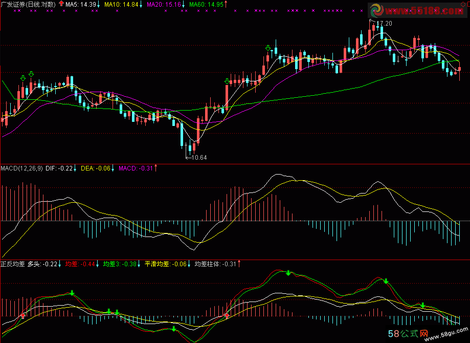 反均差:=EMA(CLOSE,26)-EMA(CLOSE,12); 正均差:=EMA(CLOSE,12)-EMA(CLOSE,26); 多头:正均差,COLORWHITE; 空头:=反均差,COLORFFCC66; 均差:(正均差-反均差),COLORRED,LINETHICK1; 均差3:EMA(均差,3),COLORGREEN; 平滑均差:EMA(正均差,9),COLORYELLOW; 均差柱体:(正均差-平滑均差)*2,COLORSTICK; DRAWICON(CROSS(均差,正均差),0,1); DRAWICON(CROSS(均差3,均差),均差,2);