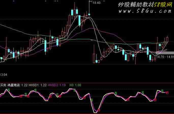 VA1:=REF((LOW+OPEN+CLOSE+HIGH)/4,1); VA2:=SMA(ABS(LOW-VA1),13,1)/SMA(MAX(LOW-VA1,0),10,1); VA3:=EMA(VA2,10); VA4:=LLV(LOW,33); VA5:=EMA(IF(LOW<=VA4,VA3,0),3); AA:=HHV(VA5,18)>100; BB:=BARSLAST(VA5>REF(VA5,1)); TT:=BB+1; HH:=REF(H,TT),LINETHICK3; XG:=CROSS(C,REF(H,TT)); HJ:=(C+HH)/2; HK:=(C+HJ)/2; HL:=(C+HK)/2; HG:=MA(HL,3); HF:=IF(HG>REF(HG,1),HG*1.008,HG*0.993); HG5:=MA(HG,5); HG5A:=MA(HG5,10); 天线:HF,COLORMAGENTA,LINETHICK2; 地线:HG,COLORYELLOW,LINETHICK2; DRAWICON(CROSS(天线,地线),天线*1.01,7); DRAWICON(CROSS(地线,天线),天线*1.01,8);