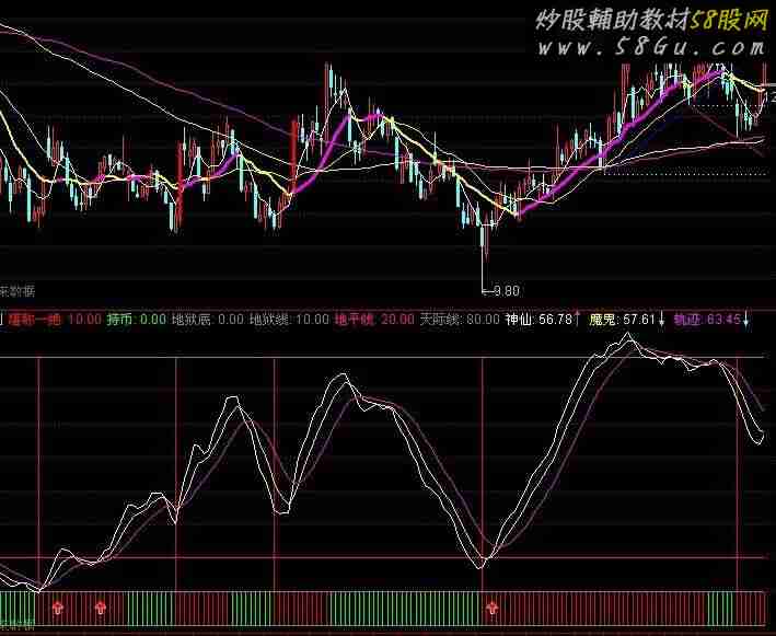 Q_1:=C-REF(C,1); Q_2:=100*EMA(EMA(Q_1,6),6)/EMA(EMA(ABS(Q_1),6),6); Q_3:=CROSS(EMA(C,19),EMA(C,7)); Q_4:=CROSS(EMA(C,7),EMA(C,19)); Z1:=L=LLV(L,BARSLAST(Q_3)+1); Z2:=LLV(L,BARSLAST(Q_3)+1); Z3:=H=HHV(H,BARSLAST(Q_4)+1); Z4:=HHV(H,BARSLAST(Q_4)+1); Q_A:=DRAWLINE(Z1,Z2,Z3,Z4,0); Y1:=H=HHV(H,BARSLAST(Q_4)+1); Y2:=HHV(H,BARSLAST(Q_4)+1); Y3:=L=LLV(L,BARSLAST(Q_3)+1); Y4:=LLV(L,BARSLAST(Q_3)+1); Q_B:=DRAWLINE(Y1,Y2,Y3,Y4,0); X1:=LLV(Q_2,2)=LLV(Q_2,7) ; X2:=COUNT(Q_2<0,2); X3:=CROSS(Q_2,MA(Q_2,2)); X4:=REF(Q_B,1)<REF(Q_B,2); X5:=Q_A>REF(Q_B,1); 买进:=(X1 AND X2 AND X3) AND X4 AND X5; TJ:=IF(Q_B<REF(Q_B,1) AND Q_B=Q_A,1,0); 堪称一绝:IF(REF(TJ,1)=0 AND TJ>=1,80,10),STICK,COLORRED; 持币:IF(Q_B<REF(Q_B,1) AND Q_B=Q_A,0,10),STICK,COLORGREEN;地狱底:0,COLORGRAY; 地狱线:10,COLORGRAY; 地平线:20,COLORLIMAGENTA; 天际线:80,COLORGRAY; RSV:=(((CLOSE - LLV(LOW,33)) / (HHV(HIGH,33) - LLV(LOW,33))) * 100); 神仙:SMA(RSV,7,1),COLORWHITE; 魔鬼:SMA(SMA(RSV,7,1),3,1),COLORYELLOW; 轨迹:SMA(SMA(SMA(RSV,6,1),5,1),3,1),COLORMAGENTA; 财神到:IF(CROSS(神仙,20),20,0),POINTDOT; DRAWICON((CROSS(神仙,20)),5,1);