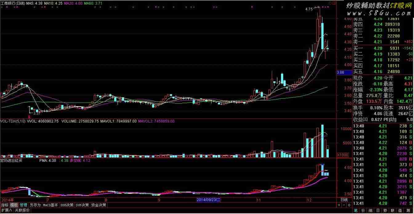 VAR1:=CLOSE>REF(CLOSE,1) AND CLOSE>REF(CLOSE,2);VAR2:=REF(VAR1,1) AND CLOSE<=REF(CLOSE,1) AND CLOSE>=REF(CLOSE,2);VAR3:=REF(VAR2,1) AND CLOSE>=REF(CLOSE,1) AND CLOSE<=REF(CLOSE,2);VAR4:=REF(VAR3,1) AND CLOSE<=REF(CLOSE,1) AND CLOSE>=REF(CLOSE,2);VAR5:=REF(VAR4,1) AND CLOSE>=REF(CLOSE,1) AND CLOSE<=REF(CLOSE,2);VAR6:=REF(VAR5,1) AND CLOSE<=REF(CLOSE,1) AND CLOSE>=REF(CLOSE,2);VAR7:=REF(VAR6,1) AND CLOSE>=REF(CLOSE,1) AND CLOSE<=REF(CLOSE,2);VAR8:=REF(VAR7,1) AND CLOSE<=REF(CLOSE,1) AND CLOSE>=REF(CLOSE,2);VAR9:=REF(VAR8,1) AND CLOSE>=REF(CLOSE,1) AND CLOSE<=REF(CLOSE,2);VARA:=REF(VAR9,1) AND CLOSE<=REF(CLOSE,1) AND CLOSE>=REF(CLOSE,2);VARB:=REF(VARA,1) AND CLOSE>=REF(CLOSE,1) AND CLOSE<=REF(CLOSE,2);VARC:=REF(VARB,1) AND CLOSE<=REF(CLOSE,1) AND CLOSE>=REF(CLOSE,2);STICKLINE(VAR1 OR VAR2 OR VAR3 OR VAR4 OR VAR5 OR VAR6 OR VAR7 ORVAR8 OR VAR9 OR VARA OR VARB OR VARC,CLOSE,REF(CLOSE,1),3,1),COLORRED;{红1}VARD:=CLOSE<REF(CLOSE,1) AND CLOSE<REF(CLOSE,2);VARE:=REF(VARD,1) AND CLOSE>=REF(CLOSE,1) AND CLOSE<=REF(CLOSE,2);VARF:=REF(VARE,1) AND CLOSE<=REF(CLOSE,1) AND CLOSE>=REF(CLOSE,2);VAR10:=REF(VARF,1) AND CLOSE>=REF(CLOSE,1) AND CLOSE<=REF(CLOSE,2);VAR11:=REF(VAR10,1) AND CLOSE<=REF(CLOSE,1) AND CLOSE>=REF(CLOSE,2);VAR12:=REF(VAR11,1) AND CLOSE>=REF(CLOSE,1) AND CLOSE<=REF(CLOSE,2);VAR13:=REF(VAR12,1) AND CLOSE<=REF(CLOSE,1) AND CLOSE>=REF(CLOSE,2);VAR14:=REF(VAR13,1) AND CLOSE>=REF(CLOSE,1) AND CLOSE<=REF(CLOSE,2);VAR15:=REF(VAR14,1) AND CLOSE<=REF(CLOSE,1) AND CLOSE>=REF(CLOSE,2);VAR16:=REF(VAR15,1) AND CLOSE>=REF(CLOSE,1) AND CLOSE<=REF(CLOSE,2);VAR17:=REF(VAR16,1) AND CLOSE<=REF(CLOSE,1) AND CLOSE>=REF(CLOSE,2);VAR18:=REF(VAR17,1) AND CLOSE>=REF(CLOSE,1) AND CLOSE<=REF(CLOSE,2);STICKLINE(VARD OR VARE OR VARF OR VAR10 OR VAR11 OR VAR12 OR VAR13 ORVAR14 OR VAR15 OR VAR16 OR VAR17 OR VAR18,CLOSE,REF(CLOSE,1),3,0),COLORFFCC66;VAR19:=REF(VARD OR VARE OR VARF OR VAR10 OR VAR11 OR VAR12 OR VAR13 ORVAR14 OR VAR15 OR VAR16 OR VAR17 OR VAR18,1) AND VAR1;STICKLINE(VAR19,REF(CLOSE,1),REF(CLOSE,2),4,1),COLORYELLOW;VAR1A:=REF(VAR1 OR VAR2 OR VAR3 OR VAR4 OR VAR5 OR VAR6 OR VAR7 OR VAR8 OR VAR9 OR VARA OR VARB OR VARC,1) AND VARD;STICKLINE(VAR1A,REF(CLOSE,1),REF(CLOSE,2),5,2),COLOR00FF00{98FD};STICKLINE(VAR19,REF(CLOSE,1),REF(CLOSE,2),3,0),COLOR00C8FF;STICKLINE(VAR19,REF(CLOSE,1),REF(CLOSE,2),2,0),COLOR10ECFF;STICKLINE(VAR19,REF(CLOSE,1),REF(CLOSE,2),2,0),COLOR10FFFF;STICKLINE(VAR1A,REF(CLOSE,1),REF(CLOSE,2),3,0),COLOR00D900;STICKLINE(VAR1A,REF(CLOSE,1),REF(CLOSE,2),3,0),COLORBLUE;STICKLINE(VAR1A,REF(CLOSE,1),REF(CLOSE,2),0,0),COLOR090FF2;PMA:MA(C,5),COLORWHITE,LINETHICK2;IF(PMA>REF(PMA,1),PMA,DRAWNULL),COLORRED,LINETHICK2;IF(PMA<REF(PMA,1),PMA,DRAWNULL),COLORGREEN,LINETHICK2;X:=(3*C+L+O+H)/6;多空线:(20*X+19*REF(X,1)+18*REF(X,2)+17*REF(X,3)+16*REF(X,4)+15*REF(X,5)+14*REF(X,6)+13*REF(X,7)+12*REF(X,8)+11*REF(X,9)+10*REF(X,10)+9*REF(X,11)+8*REF(X,12)+7*REF(X,13)+6*REF(X,14)+5*REF(X,15)+4*REF(X,16)+3*REF(X,17)+2*REF(X,18)+REF(X,20))/210,COLORFF00FF,LINETHICK2; |