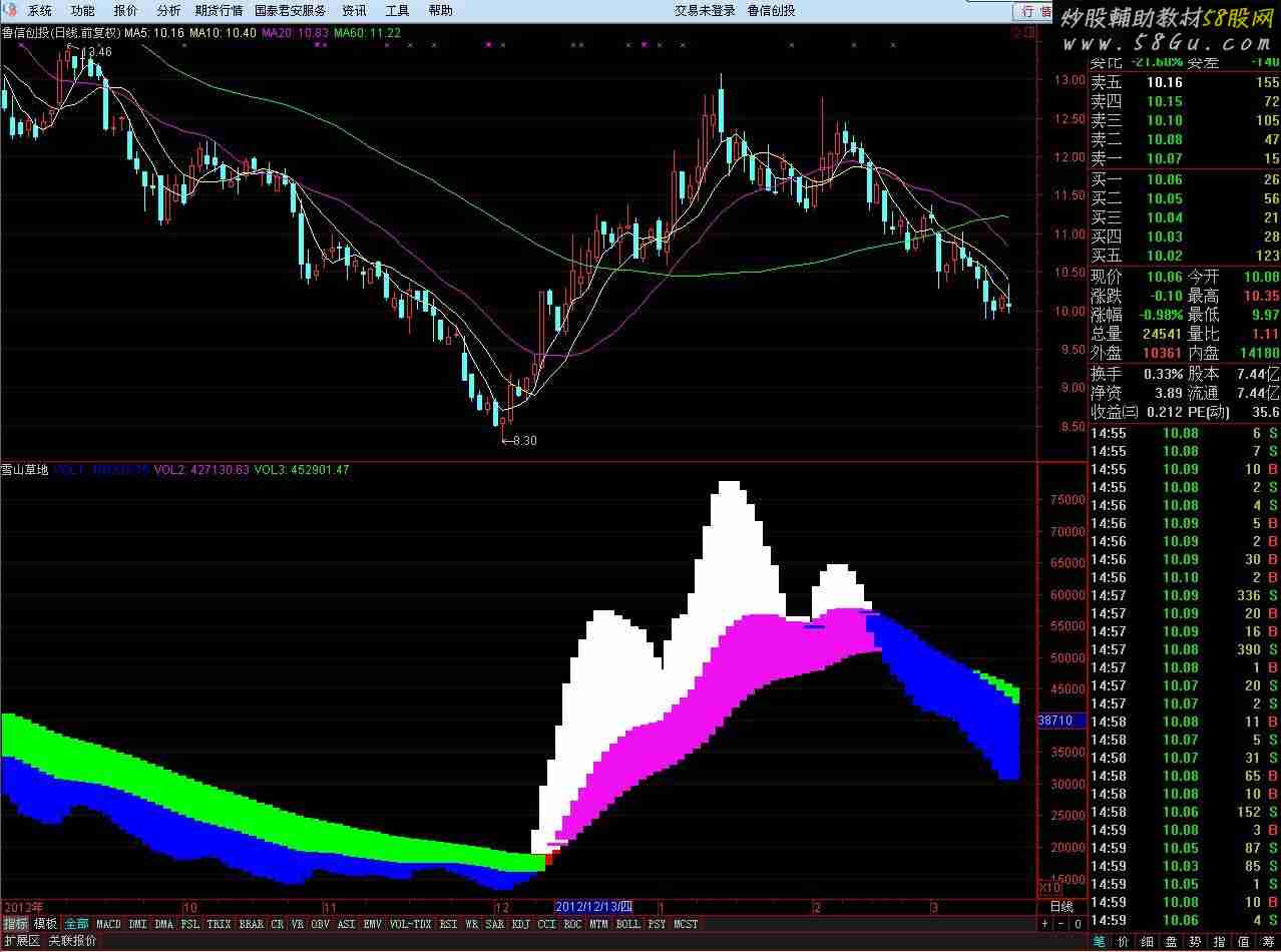 AA:=(2*O+H+L+2*C)/6; VOL1:EMA(EMA(VOL*AA,13),3),COLORBLUE; VOL2:EMA(EMA(VOL*AA,34),8),COLORF00FF0; VOL3:EMA(EMA(VOL*AA,55),13),COLOR00FF00,LINETHICK2; STICKLINE(VOL2<VOL3,VOL2,VOL3,10,0),COLORRED; STICKLINE(VOL1<VOL3,VOL1,VOL3,10,0),COLOR00FF00; STICKLINE(VOL1>VOL3,VOL1,VOL3,10,0),COLORWHITE; STICKLINE(VOL2>VOL3,VOL2,VOL3,10,0),COLORF00FF0; STICKLINE(VOL2>VOL3,VOL2,VOL3,10,0),COLORF00FF0; STICKLINE(VOL1<VOL2,VOL1,VOL2,10,0),COLORBLUE;
