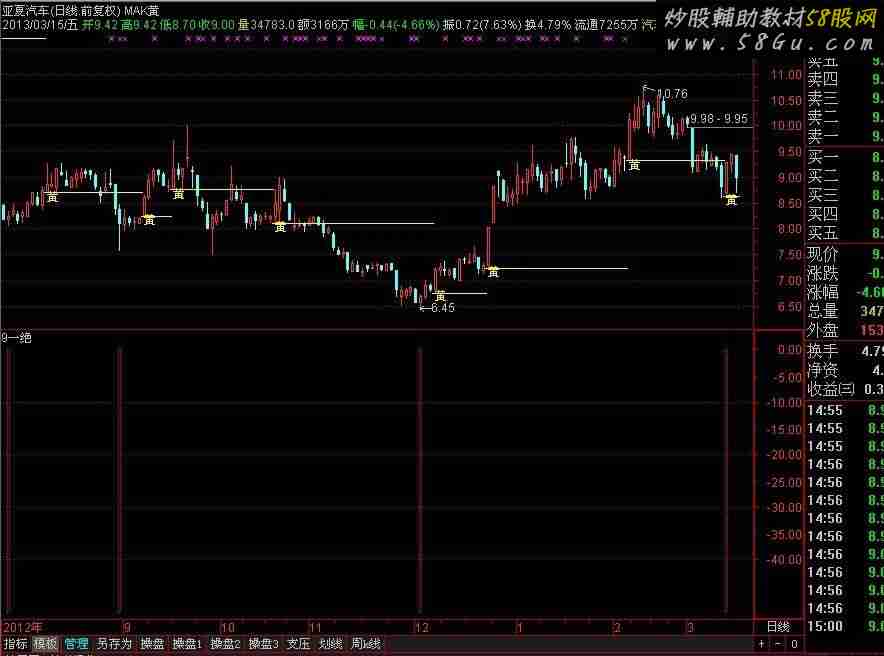 Q_1:=C-REF(C,1); Q_2:=100*EMA(EMA(Q_1,6),6)/EMA(EMA(ABS(Q_1),6),6); Q_3:=CROSS(EMA(C,19),EMA(C,7)); Q_4:=CROSS(EMA(C,7),EMA(C,19)); Z1:=L=LLV(L,BARSLAST(Q_3)+1); Z2:=LLV(L,BARSLAST(Q_3)+1); Z3:=H=HHV(H,BARSLAST(Q_4)+1); Z4:=HHV(H,BARSLAST(Q_4)+1); Q_A:=DRAWLINE(Z1,Z2,Z3,Z4,0); Y1:=H=HHV(H,BARSLAST(Q_4)+1); Y2:=HHV(H,BARSLAST(Q_4)+1); Y3:=L=LLV(L,BARSLAST(Q_3)+1); Y4:=LLV(L,BARSLAST(Q_3)+1); Q_B:=DRAWLINE(Y1,Y2,Y3,Y4,0); TJ:=IF(Q_B<REF(Q_B,1) AND Q_B=Q_A,1,0); 堪称一绝:STICKLINE(REF(TJ,1)=0 AND TJ>=1 AND CCI<-40 ,0,-50,1,-1),COLORRED;