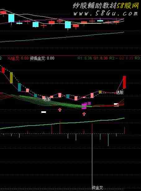 安全线: EMA(CLOSE,55), COLORLIGREEN,LINETHICK2; VAR1:=(2*CLOSE+HIGH+LOW+OPEN)/5; A1:=(EMA(VAR1,3)+EMA(VAR1,6)+EMA(VAR1,12)+EMA(VAR1,24))/4; A2:=EMA(A1,2); A3:=EMA(A2,2); A4:=EMA(A3,2); A5:=EMA(A4,2); A6:=EMA(A5,2); A7:=EMA(A6,2); A8:EMA(VAR1,2.78)*1.028,COLORMAGENTA; A9:MA(OPEN,3.2)*1.028,COLORYELLOW,DOTLINE; A:=(3*C+H+L+O)/6; XJ:=(A+0.618*REF(A,1)+0.382*REF(A,2)+0.236*REF(A,3)+0.146*REF(A,4))/2.382,COLORMAGENTA; MAA:=MA(XJ,3),COLORYELLOW,DOTLINE; PJ:=(10*A+9*REF(A,1)+8*REF(A,2)+7*REF(A,3)+6*REF(A,4)+5*REF(A,5)+4*REF(A,6)+3*REF(A,7)+ 2*REF(A,8)+REF(A,9))/55; A2I:=SUM(IF(C>REF(C,1),V*C,0),0); A3I:=SUM(IF(C<REF(C,1),V*C,0),0); A4I:=SUM(IF(C=REF(C,1),V*C,0),0); B1万元:=DVOL*DCLOSE/100; B1差:=B1万元-REF(B1万元,1); 净流入万元:=(A2I-A3I-0.5*A4I),COLOR0088FF,NODRAW; PM:=MA(净流入万元,1); PMA:=PM/REF(PM,1)>1; PMB:=REF(PMA,1)<1 AND PMA; 密码:=(EMA(MA(B1万元,2),2))/100000; 二日比:=密码/REF(密码,1); 选股:PMB AND 密码>REF(密码,1) AND 二日比>1,COLORWHITE,NODRAW; 均价:=AMOUNT/V/100; 均价2:=MA(均价,3); 均价5:=MA(均价,5); 均价10:=MA(均价,10); 均价30:=MA(均价,30); 突破:C>均价2 AND 均价2<REF(均价2,1) AND REF(均价2,1)<REF(均价2,2)AND REF(均价2,2)<REF(均价2,3) AND 选股,COLORYELLOW,NODRAW; 选票:REF(MA(C,5)<MA(C,10),1)AND CROSS(C,MA(C,5))AND CROSS(二日比,1.01),COLORMAGENTA,NODRAW; 高:=REF(HHV(XJ,80),3); 顶点:REFDATE(高,DATE),COLORBROWN,NODRAW; 低:=REF(LLV(XJ,80),3); 低点:REFDATE(低,DATE),COLORGRAY,DOTLINE; 中:(顶点+低点)/2,COLORGRAY,DOTLINE; 流入:=BARSLAST(PM/REF(PM,1)<1); 入:=EMA(EMA(流入,2),2); 入MA:=MA(入,3); 流入强度:(入-入MA),NODRAW; STICKLINE(流入强度>0,中,中+流入强度/4,0,0),COLORRED; STICKLINE(流入强度<0,中,中+流入强度/4,0,0),COLORCYAN; STICKLINE(流入强度<0 AND 流入强度>REF(流入强度,1),中,中+流入强度/4,0,0),COLORLIRED; A05:=EMA(PJ,11),COLORWHITE; XJ金叉:REF(XJ<A05,1)AND CROSS(XJ,MAA),COLORRED,NODRAW; {资金低位金叉} OA:=VOL*C; OB:=SUM(OA,1)/SUM(VOL,1); B1:=EMA(OB,17); 资金:=(OB-B1)/OB*100; FA:=EMA(资金,5)-EMA(资金,34); AA:=EMA(FA,9); 资低金叉:(CROSS(FA,AA) AND FA<-0.1),COLORWHITE,NODRAW; DI:=EMA(C,6)-EMA(C,13),; DE:=EMA(DI,5),; MACD:=2*(DI-DE),; OA1:=BARSLAST(REF(CROSS(DI,DE),1)); 底背离:=REF(C,OA1+1)>C AND DI>REF(DI,OA1+1) AND CROSS(DI,DE); STICKLINE(底背离,中,中+流入强度/4,0.1,0),COLORLIRED; DRAWTEXT(底背离,中+流入强度/4,' 底背离'),COLORLIRED; OA2:=BARSLAST(REF(CROSS(DE,DI),1)); 顶背离:=REF(C,OA2+1)<C AND REF(DI,OA2+1)>DI AND CROSS(DE,DI); STICKLINE(顶背离,中,中+流入强度/4,0.1,0),COLORLIBLUE; DRAWTEXT(顶背离,中+流入强度/4,'顶背离'),COLORCYAN; DRAWTEXT(CROSS(85,RSI),XJ,'落袋'),COLORCYAN; {DRAWTEXT(CROSS(DE,DI) AND DI>0,中+流入强度/3,'死叉'),COLORCYAN;} STICKLINE(资低金叉,低点,中,0,0),COLORWHITE; DRAWTEXT(资低金叉,低点+0.02,'资金叉'),COLORWHITE; STICKLINE(突破=1,C,O,2,0),COLORYELLOW; STICKLINE(选票=1,C,O,2,0),COLORMAGENTA; STICKLINE(选股=1,C,O,2,0),COLORWHITE; LX:=REF(XJ,1); ZD:=(SMA(MAX(XJ-LX,0),5,1)/SMA(ABS(XJ-LX),5,1))*100; KX1:=C>=O AND ZD>=50; KX2:=C<O AND ZD>=50; KX3:=C>=O AND ZD<50; KX4:=C<O AND ZD<50; STICKLINE(KX1,A8,A9,1,0),COLOR0000CC; STICKLINE(KX2,A8,A9,1,0),COLOR008888; STICKLINE(KX3,A8,A9,1,0),COLORLIRED; STICKLINE(KX4,A8,A9,1,0),COLORLICYAN,; R1:IF(A1<REF(A1,1),A1,A1),COLOR008200,LINETHICK1; Q1:IF(A1>REF(A1,1),A1,DRAWNULL),COLORRED,LINETHICK1; R2:IF(A2<REF(A2,1),A2,DRAWNULL),COLOR008C00,LINETHICK1; Q2:IF(A2>REF(A2,1),A2,DRAWNULL),COLOR000085,LINETHICK1; R3:IF(A3<REF(A3,1),A3,DRAWNULL),COLOR009B00,LINETHICK1; Q3:IF(A3>REF(A3,1),A3,DRAWNULL),COLOR00006C,LINETHICK1; R4:IF(A4<REF(A4,1),A4,DRAWNULL),COLOR00BB00,LINETHICK1; Q4:IF(A4>REF(A4,1),A4,DRAWNULL),COLOR00007D,LINETHICK1; R5:IF(A5<REF(A5,1),A5,DRAWNULL),COLOR00CC00,LINETHICK1; Q5:IF(A5>REF(A5,1),A5,DRAWNULL),COLOR00009F,LINETHICK1; R6:IF(A6<REF(A6,1),A6,DRAWNULL),COLOR00CC00,LINETHICK1; Q6:IF(A6>REF(A6,1),A6,DRAWNULL),COLOR00009F,LINETHICK1; R7:IF(A7<REF(A7,1),A7,DRAWNULL),COLOR00CC00,LINETHICK1; Q7:IF(A7>REF(A7,1),A7,DRAWNULL),COLOR00009F,LINETHICK1; DRAWTEXT(突破=1,L,'突破'),COLORYELLOW; DRAWTEXT(选票=1,C,'选票'),COLORMAGENTA; DRAWTEXT(选股=1,A8,'选股'),COLORWHITE; DRAWICON(XJ金叉=1,L-0.02,1);