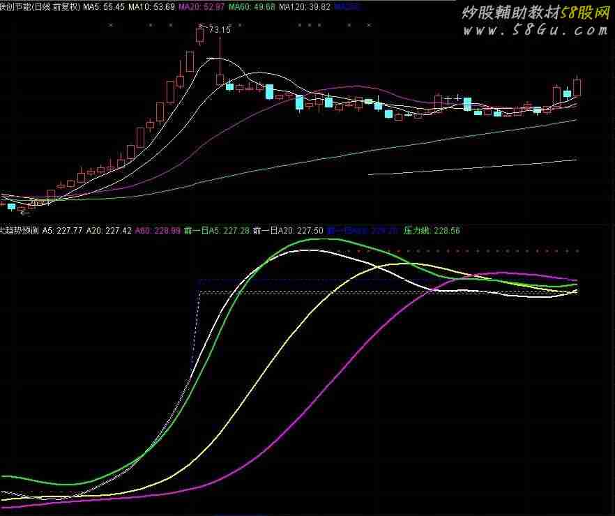 XX:=FROMOPEN+C; YY:=MA(C,1); A1:=POW(XX,2)/360-POW(YY,2)/260; A5:WMA(WMA(A1,20),5),LINETHICK2; A6:=A5*0.9999,COLORSTICK; A20:WMA(WMA(A5,20),5),LINETHICK2; A60:WMA(WMA(A20,20),5),LINETHICK2; 前一日A5:IF(CURRBARSCOUNT<40,CONST(REF(A5,1)),A5),DOTLINE; 前一日A20:IF(CURRBARSCOUNT<40,CONST(REF(A20,1)),A5),DOTLINE; 前一日A60:IF(CURRBARSCOUNT<40,CONST(REF(A60,1)),A5),DOTLINE; STICKLINE(1,HHV(A5,30),HHV(A5,30)*0.9998,0.01,0),COLORRED; 天数:=BARSSINCE(A5=HHV(A5,0)); YL:=REF(A5,1)+2.79-天数*0.01; 压力线:EMA(YL,5),COLORGREEN,LINETHICK2;