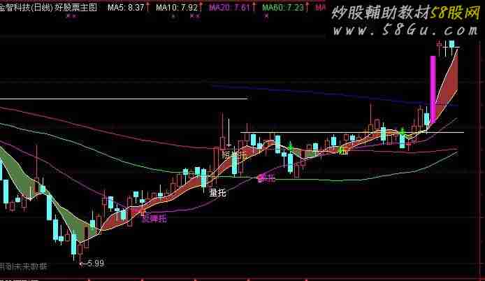 DRAWBAND(MA(CLOSE,5),RGB(155,50,50),MA(CLOSE,10),RGB(83,123,68)); DRAWKLINE(H,O,L,C); MA5:MA(CLOSE,5),COLORWHITE; MA10:MA(CLOSE,10),COLORYELLOW; MA20:MA(CLOSE,24),COLORMAGENTA; MA60:MA(CLOSE,60),COLORGREEN; MA120:MA(CLOSE,120),COLORLIMAGENTA; MA240:MA(CLOSE,240),COLORBLUE; DRAWICON(CROSS(MA10,MA20),MA20,1); {10日上穿20日做记号} DRAWICON(CROSS(MA20,MA60),MA60,1); {20日上穿60日做记号} DRAWICON(CROSS(MA20,MA120),MA120,1); {20日上穿60日做记号} DRAWICON(CROSS(MA20,MA240),MA240,1);{20日上穿120日做记号} DRAWICON(CROSS(MA60,MA120),MA60,1); {60日上穿120日做记号} DRAWICON(CROSS(MA60,MA240),MA240,1); {60日上穿240日做记号} DRAWICON(CROSS(MA120,MA240),MA240,1);{120日上穿240日做记号} DRAWICON(CROSS(MA10,MA5),MA10,2); {5日下穿10日做记号} DRAWICON(CROSS(MA20,MA10),MA20,2); {10日下穿20日做记号} DRAWICON(CROSS(MA60,MA20),MA60,2); {20日下穿60日做记号} DRAWICON(CROSS(MA120,MA60),MA60,2); {60日下穿120日做记号} 反弹托:=MA5>MA20 AND MA5>MA20 AND MA20<MA60 AND MA60<MA120 AND CROSS(MA10,MA20); 月价托:=MA5>MA20 AND MA20>MA60 AND MA60>MA120 AND MA5>MA20 AND CROSS(MA10,MA20); 季价托:=MA20>MA60 AND MA20>MA60 AND CROSS(MA20,MA60); 短长价托:=MA5>MA60 AND MA5>MA10 AND CROSS(MA10,MA60); 半年托:=MA60>MA120 AND MA60>MA120 AND CROSS(MA60,MA120); 熊来:=MA60<MA120 AND MA60<MA120 AND CROSS(MA120,MA60); 年托:=MA120>MA240 AND MA120>MA240 AND CROSS(MA120,MA240); 月蜘蛛:=MA5>MA10 AND MA10>MA20 AND CROSS(MA5,MA20)AND CROSS(MA10,MA20); DRAWTEXT(月蜘蛛,MA20-0.08,'金蜘蛛'),COLORMAGENTA; DRAWTEXT(反弹托,MA20-0.08,'反弹托'),COLORMAGENTA; DRAWTEXT(月价托 ,MA20-0.2,'月托'),COLORMAGENTA; DRAWTEXT(季价托,MA60-0.0.08,'季托'),COLORMAGENTA; DRAWTEXT(短长价托,L+0.015,'短长托'),COLOR36C0C1; DRAWTEXT(半年托,MA120-0.08,'牛市来'),COLORRED; DRAWTEXT(熊来,MA60+0.08,'小心熊'),COLORGREEN; DRAWTEXT(年托,MA240-0.08,'年托'),COLORRED; 压:=MA10<MA20 AND MA20>MA10 AND CROSS(MA20,MA10); DRAWTEXT(压,MA20+0.012,'压'),COLORYELLOW; VOL5:=MA(VOL,5),COLORWHITE; VOL10:=MA(VOL,10),COLORYELLOW; VOL40:=MA(VOL,40),COLORFF00FF ; 量托:=VOL5>=VOL40 AND CROSS(VOL10,VOL40) AND REF(VOL10,1)<REF(VOL40,1); DRAWTEXT(量托,L-0.012,'量托'),COLORWHITE; AA1:=BARSLAST(MA60>MA20 AND (MA20=MA10 OR MA20>MA10)); BB1:=REF(COUNT(C<MA60,AA1)=AA1,1); CC1:=CROSS(C,MA60) AND VOL>MA(VOL,5) AND (C-REF(C,1))/REF(C,1)*100>3; 芙蓉出水:=BB AND CC1,COLOR00FF00; DRAWTEXT(芙蓉出水,H+0.12,'芙蓉出水'),COLORFF00FF; STICKLINE(芙蓉出水,H,L,0.5,1),COLORFF00FF; STICKLINE(芙蓉出水,O,C,4,1),LINETHICK2,COLORFF00FF; MA1:=MA(CLOSE,5); MA2:=MA(CLOSE,10); MA3:=MA(CLOSE,30); ZJ:=AMOUNT/10000;{资金} TM:=V-MA(V,10);{量填满} 一穿三:=MA1>O AND MA2>O AND MA3>O AND MA1<C AND MA2<C AND MA3<C AND CLOSE>OPEN ; DRAWTEXT(一穿三,L-0.012,'穿三线'),COLORFF00FF; C6:=REF(C,1); 涨停:=IF((C-C6)*100/C6>=(10-0.01*100/C6),1,0); STICKLINE(涨停,OPEN,CLOSE,2,0),COLORMAGENTA; STICKLINE(涨停,H,L,0,0),COLORLIRED; {压力一} TY:=C; A1:=REF(TY,10)=HHV(TY,2*10+1); B1:=FILTER(A1,10); C1:=BACKSET(B1,10+1); HD:=FILTER(C1,10); A2:=REF(TY,10)=LLV(TY,2*10+1); B2:=FILTER(A2,10); C2:=BACKSET(B2,10+1); LD:=FILTER(C2,10); 前期高位:REF(C,BARSLAST(HD)),COLOR00FF00,POINTDOT; STICKLINE(C,前期高位,前期高位,8,0),COLORYELLOW;