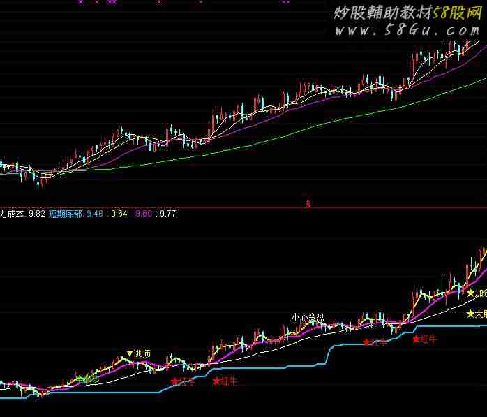 信号提示精准及时,机构在用,炒股变得如此简单!A:=(3*C+L+O+H)/6; X:=(20*A+19*REF(A,1)+18*REF(A,2)+17*REF(A,3)+16*REF(A,4)+15*REF(A,5)+ 14*REF(A,6)+13*REF(A,7)+12*REF(A,8)+11*REF(A,9)+10*REF(A,10)+9*REF(A,11)+8*REF(A,12) +7*REF(A,13)+6*REF(A,14)+5*REF(A,15)+4*REF(A,16)+3*REF(A,17)+2*REF(A,18)+ REF(A,20))/210; S2:=SMA(C,3,1); S6:=SMA(C,5,1); DK:=2*(S2-S6);主力成本:EMA(X,13),COLORFF00FF,LINETHICK0;短期底部:LLV(HIGH,30),LINETHICK2,COLORFFCC00; IF(MA(C,3),MA(C,3),DRAWNULL),coloryellow,LINETHICK2; IF(MA(C,9),MA(C,9),DRAWNULL),colormagenta,LINETHICK2; IF(MA(C,23.5),MA(C,23.5),DRAWNULL),colorwhite; DRAWKLINE(HIGH,OPEN,LOW,CLOSE); MA5:=MA(C,5); MA10:=MA(C,10); MA30:=MA(C,30); FA:=BARSLAST(CROSS(MA10,MA5)) AND CROSS(MA5,MA10); FB:=FA AND MA5>MA30 AND MA10>MA30 AND MA10>REF(MA10,1); DRAWTEXT(FB,L-0.58,'★红牛'),colorred; V1:=EMA(CLOSE,5); V2:=EMA(EMA(CLOSE,90)*1.01,10); DRAWTEXT(CROSS(V1,V2),V1+0.05,'牛起步'),COLOR00FF00; VAR1:=LLV(LOW,21); VAR2:=HHV(HIGH,21); AK1:=EMA((((CLOSE - VAR1) / (VAR2 - VAR1)) * 100),5); AK:=EMA((((CLOSE - VAR1) / (VAR2 - VAR1)) * 50),13); AB:=CROSS(AK1,AK); DRAWTEXT((AB = 1),(LOW * 0.99),'○牛窝'),coloryellow; AA1:=AMOUNT/V; BB1:=L<AA1*0.9; CC1:=(C-REF(C,1))/REF(C,1)*100>1.2; DD1:=L<MA(C,5)*0.921; EE1:=V<MA(V,5)*1.5;铁树开花:=BB1 AND CC1 AND DD1 AND EE1,LINETHICK0,COLOR0099FF; DRAWTEXT(铁树开花,L*0.99,'铁树开花'),COLOR0099FF; VAR3AA:=IF((CLOSE>REF(CLOSE,1)),88,0); VAR4AA:=IF(((CLOSE)/(REF(CLOSE,1))>1.05) AND ((HIGH)/(CLOSE)<1.01) AND (VAR3AA>0),91,0); DRAWTEXT(FILTER((VAR4AA>90),45),(LOW)*(0.93),'★大胆搏 '),COLOR00FFFF; DRAWTEXT(FILTER((VAR4AA>90),35),(LOW)*(0.99000001),'★加仓'),COLOR00FFFF; A1AA:=9; A2AA:=(REF(CLOSE,A1AA+1)<CLOSE); DRAWTEXT(FILTER((A2AA>-0.5),84),(HIGH)*(1.05),'小心变盘'),COLORFFFFFF; VAR6:=REF(C,1); VAR7:=SMA(MAX(C-VAR6,0),6,1)/SMA(ABS(C-VAR6),6,1)*100; DRAWTEXT(CROSS(82,VAR7),H*1.01,'▼逃顶'),coloryellow; |
