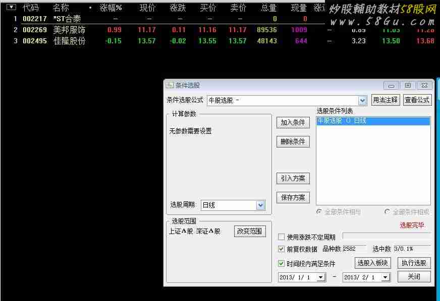 一组简单的交易组合,能选出好票,也有差的.想寻找一个可以衡量信号点是否是在一波趋势的初期,或者衡量信号点的成功率高些, 希望优化后预期收益是最多持股2个月收益超过10%,最好能只留下大牛MA1:=MA(C,5);MA2:=MA(C,10);MA3:=MA(C,20);MA4:=MA(C,60);MA5:=MA(C,120);MA6:=MA(C,250);A8:=BARSLAST(CROSS(MA3,MA4))<10;A5:=V>REF(V,1) AND REF(V,1)>REF(V,2) AND H/C<1.01 AND REF(C>O,1);D?o?:MA2>MA3 AND MA3>MA4 AND MA1<MA3 AND MA1>REF(MA1,1) AND MA4>REF(MA4,1) AND C>O AND A8 AND A5;