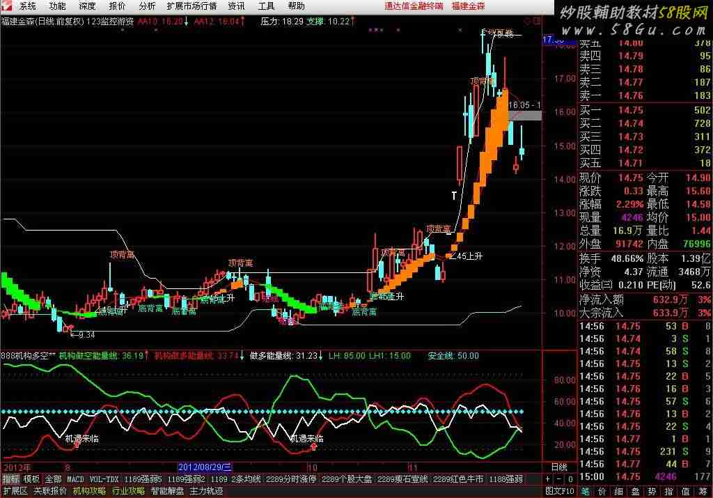 {123监控游资} SAT:=IF((AMOUNT/C)/(HHV(AMOUNT,20)/HHV(C,20))*100>100,100,(AMOUNT/C)/(HHV(AMOUNT,20)/HHV(C,20))*100); AA10:MA(CLOSE,8),COLOR0000FF;AA12:MA(CLOSE,12),COLOR0000FF;BB10:=((ATAN((AA10 - REF(AA10,1))) * 3.1416) * 10); BB12:=((ATAN((AA12 - REF(AA12,1))) * 3.1416) * 10);MA13:=MA(CLOSE,13); STICKLINE((((AA12 <= AA10) AND (BB12 >= 1)) AND (BB10 >= 1)),AA10,AA12,4,0),COLOR0080FF; STICKLINE((((AA12 >= AA10) AND (BB10 <= 1)) AND (BB10 <= 1)),AA10,AA12,4,0),COLOR00FF00; X1:=(C+L+H)/3;BB13:=ATAN(EMA(X1,13)-REF(EMA(X1,13),1))*3.1416*10; EMA8:=EMA(C,8);DRAWTEXT(FILTER(BB13>1 AND EMA(X1,13)>REF(EMA(X1,8),1),10), EMA8,'∠45上升'),COLORWHITE;压力:MA(REF(HHV(C,30),1),2),COLOR9DFFFF; 支撑:MA(REF(LLV(C,30),1),2),COLORABFF46; AA1:=AMOUNT/V;BB1:=L<AA1*0.9; CC1:=(C-REF(C,1))/REF(C,1)*100>1.2;DD1:=L<MA(C,5)*0.921;EE1:=V<MA(V,5)*1.5; FF1:=BB1 AND CC1 AND DD1 AND EE1;DRAWTEXT(FF1,(LOW* 0.99),'老鼠仓'),COLOR4080FF; A51:=3*SMA((C-LLV(L,55))/(HHV(H,55)-LLV(L,55))*100,5,1)-2*SMA((C-LLV(L,55))/(HHV(H,55)-LLV(L,55))*100,5,1); 黑马线:=EMA(A51,5);A54:=((C-LLV(L,21))/(HHV(H,21)-LLV(L,21)))*100; 趋势线:=(MA(3*SMA(A54,6,1)-2*SMA(SMA(A54,5,1),5,1),2)); DRAWTEXT(CROSS(趋势线,0)AND 黑马线<40,(HIGH* 0.97),'▲大黑马'),COLORYELLOW; LC:=REF(CLOSE,1);RSI:=((SMA(MAX((CLOSE - LC),0),3,1) / SMA(ABS((CLOSE - LC)),3,1)) * 100); FF:=EMA(CLOSE,3);MA15:=EMA(CLOSE,21);DRAWTEXT(CROSS(FF,MA15),(LOW * 0.99),'底背离'),COLORA6E500; DRAWTEXT(CROSS(88,RSI),(HIGH * 1.02),'顶背离'),COLOR1880FF; VAR2:=LLV(LOW,27);VAR3:=HHV(HIGH,34);VAR4:=EMA((CLOSE-VAR2)/(VAR3-VAR2)*4,4)*25; 注意买:=IF((VAR4<10),80,100);RSV:=(C-LLV(L,9))/(HHV(H,9)-LLV(L,9))*100; K:=SMA(RSV,3,1);D:=SMA(K,3,1);J:=3*K-2*D;超跌:=IF(J<0,10,0);BDDD:=LLV(J,2)=LLV(J,8); 买入:=IF(CROSS(J,REF(J+0.01,1)) AND BDDD AND J<20,30,0); DRAWTEXT(买入 AND 注意买=100 AND 超跌=0,LOW,'短线'),COLOR8000FF; MTM:=C-REF(C,1);DX:=100*EMA(EMA(MTM,6),6)/EMA(EMA(ABS(MTM),6),6); 买:=IF(LLV(DX,2)=LLV(DX,7) AND COUNT(DX<0,2) AND CROSS(DX,MA(DX,2)),1,0);