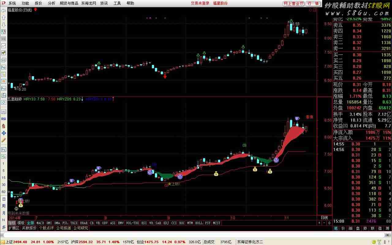 W5:=COST(5); W10:=COST(10);{5-20反弹买入区} W50:=COST(50);{20-50整理区} W90:=COST(90);{50-80安全持股区} W99:=COST(99);{80-100主升风险卖出区} 粘合度:=(W90-W10)/W10*100; HR:=HHV(HIGH,55); HRY:=LLV(LOW,55); HRY11:=HR*HRY; HRY33:SQRT(HRY11),COLORGREEN,LINETHICK1; IF(C>HRY33 AND HRY33 >=REF(HRY33 ,1), HRY33 ,DRAWNULL),LINETHICK1,COLORRED; H38:=HHV(HIGH,3); HR38:=LLV(LOW,3); HRY38:=H38*HR38; HRYZS5:SQRT(HRY38),COLOR00FF00,LINETHICK1; H13:=HHV(HIGH,8); HR13:=LLV(LOW,8); HRY13:=H13*HR13; HRYZS13:SQRT(HRY13),COLORFF0000,LINETHICK1; DRAWBAND(HRYZS5,RGB(200,50,55),HRYZS13,RGB(0,100,50)); B:=EMA(C,2); S:=EMA(SLOPE(C,21)*20+C,42); BUY:=CROSS(B,S) AND C<LLV(L,55)*1.193; SEL:=CROSS(S,B) AND C>LLV(L,55)*1.3; DRAWICON(BUY,L*0.98,6); DRAWICON(SEL,H*1.03,7); GET:=ZIG(3,3); PL5:=ZIG(3,5); EN1:=ZIG(3,5)>REF(ZIG(3,5),1) AND REF(ZIG(3,5),1)<=REF(ZIG(3,5),2) AND REF(ZIG(3,5),2)<=REF(ZIG(3,5),3); EX1:=ZIG(3,5)<REF(ZIG(3,5),1) AND REF(ZIG(3,5),1)>=REF(ZIG(3,5),2) AND REF(ZIG(3,5),2)>=REF(ZIG(3,5),3); PL10:=ZIG(3,10); EN2:=ZIG(3,10)>REF(ZIG(3,10),1) AND REF(ZIG(3,10),1)<=REF(ZIG(3,10),2) AND REF(ZIG(3,10),2)<=REF(ZIG(3,10),3); EX2:=ZIG(3,10)<REF(ZIG(3,10),1) AND REF(ZIG(3,10),1)>=REF(ZIG(3,10),2) AND REF(ZIG(3,10),2)>=REF(ZIG(3,10),3); PL20:=ZIG(3,20); EN3:=ZIG(3,20)>REF(ZIG(3,20),1) AND REF(ZIG(3,20),1)<=REF(ZIG(3,20),2) AND REF(ZIG(3,20),2)<=REF(ZIG(3,20),3); EX3:=ZIG(3,20)<REF(ZIG(3,20),1) AND REF(ZIG(3,20),1)>=REF(ZIG(3,20),2) AND REF(ZIG(3,20),2)>=REF(ZIG(3,20),3); PL40:=ZIG(3,40); 走强1:=BARSLAST(PL5<REF(PL5,1)); 走弱1:=BARSLAST(PL5>REF(PL5,1)); 走强2:=BARSLAST(PL10<REF(PL10,1)); 走弱2:=BARSLAST(PL10>REF(PL10,1)); 走强3:=BARSLAST(PL20<REF(PL20,1)); 走弱3:=BARSLAST(PL20>REF(PL20,1)); ZTJZ5:=IF(PL10>REF(PL10,1),COUNT(EN1,走强2),0); ZTJD5:=IF(PL10>REF(PL10,1),COUNT(EX1,走强2),0); DTJZ5:=IF(PL10<REF(PL10,1),COUNT(EN1,走弱2),0); DTJD5:=IF(PL10<REF(PL10,1),COUNT(EX1,走弱2),0); ZTJZ10:=IF(PL20>REF(PL20,1),COUNT(EN2,走强3),0); ZTJD10:=IF(PL20>REF(PL20,1),COUNT(EX2,走强3),0); DTJZ10:=IF(PL20<REF(PL20,1),COUNT(EN2,走弱3),0); DTJD10:=IF(PL20<REF(PL20,1),COUNT(EX2,走弱3),0); DRAWTEXT(EN1 AND DTJZ5=1,L*0.98,'【A】'),COLOR00FFFF; DRAWTEXT(EX1 AND DTJD5=2,H*1.02,'【B】'),COLOR00FF00; DRAWTEXT(EN2 AND ZTJZ5=1,L*0.98,'【C】'),COLOR0000FF; DRAWTEXT(EX1 AND PL10>REF(PL10,1) AND ZTJD5=1,H*1.02,'⑴'),COLORFF0000; DRAWTEXT(EN1 AND PL10>REF(PL10,1) AND ZTJZ5=2,L*0.98,'⑵'),COLOR0000FF; DRAWTEXT(EX1 AND PL10>REF(PL10,1) AND ZTJZ5=2,H*1.02,'⑶'),COLOR00FF00; DRAWTEXT(EN1 AND PL10>REF(PL10,1) AND ZTJZ5=3,L*0.98,'⑷'),COLORFF00FF; DRAWTEXT(EX2 AND PL20>REF(PL20,1) AND ZTJD10=1,H*1.02,'⑸'),COLOR00FF00; DRAWTEXT(EN2 AND DTJZ10=1,L*0.93,'〖Ⅰ〗'),COLORFF00FF; DRAWTEXT(EX2 AND DTJD10=2,H*1.05,'〖Ⅱ〗'),COLOR00FF00; DRAWTEXT(EN3 AND ZTJZ10=1,L*0.93,'〖Ⅲ〗'),COLOR0000FF; DRAWTEXT(EX2 AND PL20>REF(PL20,1) AND ZTJD10=1,H*1.03,'①'),LINETHICK3,COLORFFFF00; DRAWTEXT(EN2 AND PL20>REF(PL20,1) AND ZTJZ10=2,L*0.95,'②'),LINETHICK3,COLOR00FFFF; DRAWTEXT(EX2 AND PL20>REF(PL20,1) AND ZTJD10=2 OR (ZTJD10=0 OR ZTJD10=2) AND EX2,H*1.03,'③'),LINETHICK3,COLOR00FF00; DRAWTEXT(EN2 AND PL20>REF(PL20,1) AND ZTJZ10=3,L*0.95,'④'),LINETHICK3,COLOR00FFFF; P1:=5; P2:=10; P3:=20; P4:=30; P5:=60; P6:=120; P7:=240; P8:=340; N:=4; WX:=MA(CLOSE,0); M1:=MA(CLOSE,P1); M2:=(MA(CLOSE,P2) * IF((N < 2),WX,1)); M3:=(MA(CLOSE,P3) * IF((N < 3),WX,1)); M4:=(MA(CLOSE,P4) * IF((N < 4),WX,1)); M5:=(MA(CLOSE,P5) * IF((N < 5),WX,1)); M6:=(MA(CLOSE,P6) * IF((N < 6),WX,1)); M7:=(MA(CLOSE,P7) * IF((N < 7),WX,1)); M8:=(MA(CLOSE,P8) * IF((N < 8),WX,1)); C1:=REF(CLOSE,1); C2:=HHV(C1,2); C3:=LLV(C1,1); ET:=HHV(C1,2); ET1:=REF(ET,1); XB:=LLV(C1,1); XB1:=REF(XB,1); M:=BARSLAST(((CLOSE < XB) AND (C1 >= XB1))); M11:=REF(M,1); N9:=BARSLAST(((CLOSE > ET) AND (C1 <= ET1))); N1:=REF(N9,1); M21:=(BARSLAST((((M - N9) > 0) AND (M11 <= N1))) + 1); N2:=(BARSLAST((((N9 - M) > 0) AND (N1 <= M11))) + 1); ET2:=HHV(ET,M21); XB2:=LLV(XB,N2); A:=IF((((M - N9) > 0) AND (M11 <= N1)),1,IF((((N9 - M) > 0) AND (N1 <= M11)),0,2)); H1:=IF(((M - N9) > 0),CLOSE,ET2); H2:=IF((A = 1),CLOSE,C2); H3:=IF(((M - N9) < 0),CLOSE,XB2); H4:=IF((A = 1),CLOSE,XB2); H5:=IF((((M - N9) > 0) OR (A = 1)),CLOSE,H3); H6:=REF(H5,1); H7:=REF(H5,2); H8:=(H5 > H6); H9:=(((H4 = REF(H4,1)) AND (REF(H4,1) < REF(H4,2))) AND (H5 > REF(H5,2))); H10:=(((H2 = REF(H2,1)) AND (H4 = REF(H4,1))) AND (H5 = REF(H5,2))); W:=((H8 OR H9) OR H10); T9:=((H5 < H6) AND (H5 < REF(H5,2))); T10:=((H4 = REF(H4,1)) AND (H5 < REF(H5,2))); T11:=((H3 > REF(H3,1)) AND (H5 < REF(H5,1))); T12:=((H5 = REF(H5,1)) AND (H3 = H4)); T13:=((H2 = REF(H2,1)) AND (H2 = H5)); TW:=((((T9 OR T10) OR T11) OR T12) OR T13); PK:=((AMOUNT * (((OPEN + CLOSE) + HIGH) + LOW)) / 4); PK1:=IF((VOL > 0),(PK / AMOUNT),((((OPEN + CLOSE) + HIGH) + LOW) / 4)); BBP:=(((CLOSE - LLV(LOW,9)) / (HHV(HIGH,9) - LLV(LOW,9))) * 100); DRAWTEXT((ISLASTBAR AND (BBP >= 96.5)),(H5 * 1.033),'明见短高,龙头除外'),COLOR00FF00; DRAWTEXT((ISLASTBAR AND (BBP < 1)),((H5 + H4) / 1.96),'明见短低,跌停除外'),COLOR0000FF; DRAWTEXT(((ISLASTBAR AND W) AND (BBP < 96.5)),(H5 * 1.033),'看涨'),COLOR0015FF; DRAWTEXT(((ISLASTBAR AND TW) AND (BBP > 1)),((H5 + H4) / 2),'看跌'),COLOR00FF00; DM:=CROSS((4*SMA((CLOSE-LLV(LOW,25))/(HHV(HIGH,25)-LLV(LOW,25))*100,5,1) -3*SMA(SMA((CLOSE-LLV(LOW,25))/(HHV(HIGH,25)-LLV(LOW,25))*100,5,1),3,1)),8); DRAWTEXT(DM,L*0.98,'★上轿!'),COLORBROWN; CBFB:=COSTEX(C,REF(C,1)); JL:=IF(C>CBFB,V,0); CL:=IF(C<CBFB,V,0); JLH:=SUM(JL,4); CLH:=SUM(CL,4); LHB:=CLH/JLH; TJ16:=IF(HHV(LHB,5)>4 AND CROSS(2,LHB) AND C>=O,1,0); DRAWICON(TJ16,L*0.96,9); JLHS:=SUM(JL,4); CLHS:=SUM(CL,4); LHS:=JLHS/CLHS; TJS1:=IF(HHV(LHS,5)>4 AND CROSS(2,LHS) AND C<O,1,0); DRAWICON(TJS1,H*1.0096,19); |
