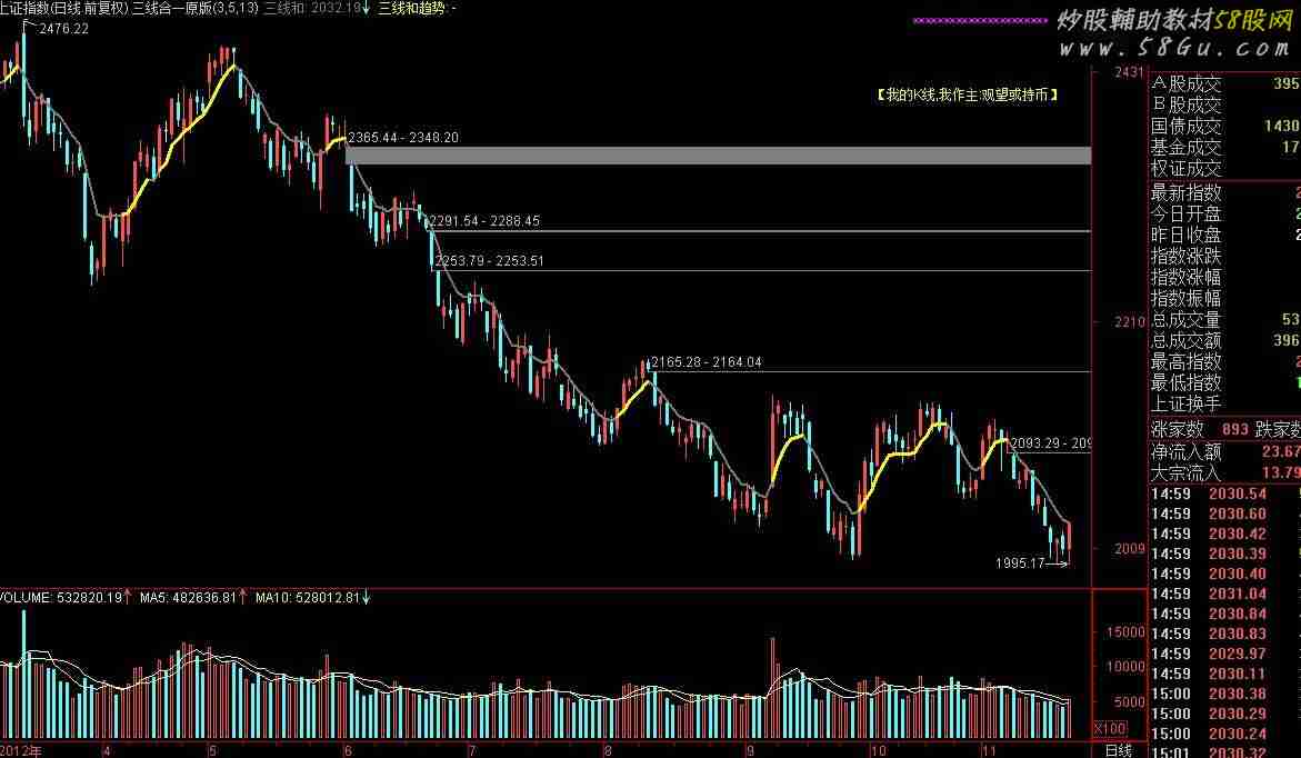 {游侠_三线合一主图指标,适合主图及分时} N1:=3; N2:=5; N3:=13; 三线和:(MA(C,N1)+MA(C,N2)+MA(C,N3))/3 COLORGREEN LINETHICK2; 三线和趋势:IF(三线和>REF(三线和,1),三线和,DRAWNULL) COLORRED LINETHICK3;