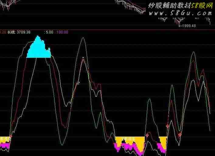 RSV1:=(CLOSE-LLV(LOW,21))/(HHV(HIGH,21)-LLV(LOW,21))*10000; RSV2:=(CLOSE-LLV(LOW,37))/(HHV(HIGH,37)-LLV(LOW,37))*10000; 短线:SMA(SMA(RSV1,3,1),3,1)+3*STD(CLOSE,21),COLOR00FF00; 中线:SMA(RSV2,5,1)+2*STD(CLOSE,37),COLORRED; RSV3:=(CLOSE-LLV(LOW,55))/(HHV(HIGH,55)-LLV(LOW,55))*10000; 长线:SMA(RSV3,5,1),COLORYELLOW; 看底:STICKLINE(中线<1500,中线,1500,6,0),COLORF00FF0; 黄金坑:STICKLINE(短线<2000 AND 中线<2000 AND 长线<2000,MAX(长线,MAX(短线,中线)),2000,8,0),COLOR00CCFF; 看顶:STICKLINE(中线>8000,8000,中线,6,0),COLORFFF000; DRAWICON(CROSS(长线,1500),中线,1); DRAWTEXT(LONGCROSS(中线,2000,1500),2000,'追涨'); DRAWTEXT(CROSS(短线,长线)AND 长线<1800 AND 长线>REF(长线,1) OR CROSS(长线,5),2000,'千载难逢'); 粘合星:DRAWTEXT(ABS(中线-长线)<20 AND 中线>REF(中线,1),中线,'*'); 中线2:=-10000*(HHV(HIGH,40)-CLOSE)/(HHV(HIGH,40)-LLV(LOW,40)); 底:DRAWTEXT(CROSS(中线2,-90) AND (长线<中线 AND 长线>REF(长线,1)OR 短线<2000 AND 中线<2000 AND 长线<2000),长线,'底'),COLORFF00FF; IF(COUNT(CROSS(中线2,-90),12)=3,30,5); IF(COUNT(CROSS(-5,中线2),12)=3 OR COUNT(CROSS(-15,中线2),6)=3,70,100);