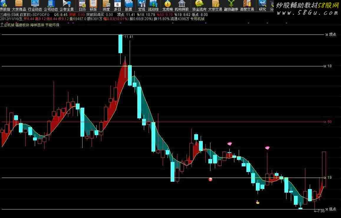 N:=3; DRAWBAND(MA(C,2),RGB(150,10,10),MA(C,5),RGB(0,100,100)); DRAWKLINE(H,O,L,C); Q5:MA(C,5),COLORYELLOW; X:=C=HHV(C,20); D:=BARSLAST(X); XD:=IF(D>0,REF(C,D),REF(C,D)); JC:=CROSS(C,REF(XD,1)); 突破1:=JC AND COUNT(JC,5)=1,COLORYELLOW;强势股:=H/REF(L,1)>1.15 OR H/REF(L,2)>1.18; 回调:=L/REF(H,1)<0.96 AND C<REF(C,1); 买入:=REF(强势股,1) AND 回调;TY:=H;AA1:=REF(TY,N)=HHV(TY,2*N+1); BA1:=FILTER(AA1,N); CA1:=BACKSET(BA1,N+1); HD1:=FILTER(CA1,N); AA2:=REF(TY,N)=LLV(TY,2*N+1); BA2:=FILTER(AA2,N); CA2:=BACKSET(BA2,N+1); LD1:=FILTER(CA2,N); 前高1:=REF(H,BARSLAST(HD1)),COLORRED,NODRAW; 突破:突破1 AND C>前高1,COLORRED,NODRAW; 突破回调买:IF(COUNT(突破,5)=1 AND 突破=0 AND 买入 AND C>前高1,-2,0),NODRAW;DRAWICON(突破,REF(H,1)*1.02,24); DRAWICON(突破回调买=-2,REF(H,1)*1.02,12); 高:=REF(HHV(H,80),3); 低:=REF(LLV(L,80),3); H18:=高-(高-低)*0.181; L19:=低+(高-低)*0.181; H中:=高-(高-低)*0.5;顶点:REFDATE(高,DATE),COLORWHITE; %18:REFDATE(H18,DATE),COLORYELLOW; %50:REFDATE(H中,DATE),COLORRED; %19:REFDATE(L19,DATE),COLORYELLOW; 低点:REFDATE(低,DATE),COLORWHITE; DRAWTEXT(ISLASTBAR,顶点,' %顶点'),COLORWHITE; DRAWTEXT(ISLASTBAR,%18,'%18'),COLORYELLOW; DRAWTEXT(ISLASTBAR,%50,'%50'),COLORRED; DRAWTEXT(ISLASTBAR,%19,'%19'),COLORYELLOW; DRAWTEXT(ISLASTBAR,低点,' %低点'),COLORWHITE;Z1:=STRCAT(HYBLOCK,' '); Z2:=STRCAT(Z1,DYBLOCK); Z3:=STRCAT(Z2,' '); DRAWTEXT_FIX(ISLASTBAR,0,0,0,STRCAT(Z3,GNBLOCK)),COLOR00C0C0; A1:=REF(H,N)=HHV(H,2*N+1); B1:=FILTER(A1,N); C1:=BACKSET(B1,N+1); D1:=FILTER(C1,N); A2:=REF(L,N)=LLV(L,2*N+1); B2:=FILTER(A2,N); C2:=BACKSET(B2,N+1); D2:=FILTER(C2,N); E1:=(REF(LLV(L,2*N),1)+REF(HHV(H,2*N),1))/2; E2:=(H+L)/2; H1:=(D1 AND NOT(D2 AND E1>=E2)) OR ISLASTBAR OR BARSCOUNT(C)=1; L1:=(D2 AND NOT(D1 AND E1<E2)); H2:=D1 AND NOT(D2 AND E1>=E2); X1:=REF(BARSLAST(H1),1)+1; F1:=BACKSET(H1 AND COUNT(L1,X1)>0,LLVBARS(IF(L1,L,10000),X1)); G1:=F1>REF(F1,1); I1:=BACKSET(G1,2); LD:=I1>REF(I1,1); L2:=LD OR ISLASTBAR OR BARSCOUNT(C)=1; X2:=REF(BARSLAST(L2),1)+1; F2:=BACKSET(L2 AND COUNT(H2,X2)>0,HHVBARS(IF(H2,H,0),X2)); G2:=F2>REF(F2,1); I2:=BACKSET(G2,2); HD:=I2>REF(I2,1); R1:=BACKSET(ISLASTBAR,BARSLAST(HD)+1); S1:=R1>REF(R1,1),COLORRED,NODRAW;T1:=BACKSET(ISLASTBAR,BARSLAST(LD)+1); U1:=T1>REF(T1,1),COLORRED,NODRAW;R2:=BACKSET(S1,REF(BARSLAST(HD),1)+2); S2:=R2>REF(R2,1),COLORRED,NODRAW;T2:=BACKSET(U1,REF(BARSLAST(LD),1)+2); U2:=T2>REF(T2,1),COLORRED,NODRAW;DRAWICON(U1,L*0.98,11); DRAWICON(S1,H*1.01,25); DRAWICON(U2,L*0.98,13); DRAWICON(S2,H*1.01,25); NOTEXT1:=DRAWLINE(S2,H,S1,H,1),LINETHICK2,COLORRED; NOTEXT2:=DRAWLINE(U2,L,U1,L,1),LINETHICK2,COLORGREEN;前二高:=REF(H,BARSLAST(S2)),COLOR99FF66,LINETHICK1,DOTLINE; 前高:=REF(H,BARSLAST(S1)),COLOR99FF66,LINETHICK2,DOTLINE;前二低:=REF(L,BARSLAST(U2)),COLORYELLOW,LINETHICK1,DOTLINE;下降压力:=DRAWLINE(HIGH>=HHV(HIGH,10),HIGH,LOW<=LLV(LOW,3) ,HHV(HIGH,3),1),COLORYELLOW,LINETHICK2; |