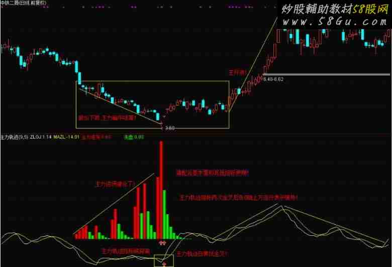 N1:=9;N2:=5; MTM:=C-REF(C,1); 主力轨迹:100*EMA(EMA(MTM,N1),N1)/EMA(EMA(ABS(MTM),N1),N1),COLORWHITE; MAZL:MA(主力轨迹,N2),COLORYELLOW; VAR1:=REF((LOW+OPEN+CLOSE+HIGH)/4,1); VAR2:=SMA(ABS(LOW-VAR1),13,1)/SMA(MAX(LOW-VAR1,0),10,1); VAR3:=EMA(VAR2,10); VAR4:=LLV(LOW,33); VAR5:=EMA(IF(LOW<=VAR4,VAR3,0),3); 主力进场:IF(VAR5>REF(VAR5,1),VAR5,0),COLORRED,NODRAW; STICKLINE(VAR5>REF(VAR5,1),0,VAR5,3,0 ),COLOR000055; STICKLINE(VAR5>REF(VAR5,1),0,VAR5,2.6,0 ),COLOR000077; STICKLINE(VAR5>REF(VAR5,1),0,VAR5,2.1,0 ),COLOR000099; STICKLINE(VAR5>REF(VAR5,1),0,VAR5,1.5,0 ),COLOR0000BB; STICKLINE(VAR5>REF(VAR5,1),0,VAR5,0.9,0 ),COLOR0000DD; STICKLINE(VAR5>REF(VAR5,1),0,VAR5,0.3,0 ),COLOR0000FF; 洗盘:IF(VAR5<REF(VAR5,1),VAR5,0),COLOR000079,NODRAW; STICKLINE(VAR5<REF(VAR5,1),0,VAR5,3,0),COLOR000079; STICKLINE(VAR5<REF(VAR5,1),0,VAR5,2.6,0),COLOR000093; STICKLINE(VAR5<REF(VAR5,1),0,VAR5,2.1,0),COLOR0000C6; STICKLINE(VAR5<REF(VAR5,1),0,VAR5,1.5,0),COLOR4A4AFF; STICKLINE(VAR5<REF(VAR5,1),0,VAR5,0.9,0),COLOR7D7DFF; STICKLINE(VAR5<REF(VAR5,1),0,VAR5,0.3,0),COLORAAAAFF; VAR21:=SMA(ABS(HIGH-VAR1),13,1)/SMA(MIN(HIGH-VAR1,0),10,1); VAR31:=EMA(VAR21,10); VAR41:=HHV(HIGH,33); VAR51:=EMA(IF(HIGH>=VAR41,VAR31,0),3); 主力拉高:IF(VAR51<REF(VAR51,1),VAR51,0),COLORYELLOW,NODRAW; STICKLINE(VAR51<REF(VAR51,1),0,VAR51,3,0),COLOR005555; STICKLINE(VAR51<REF(VAR51,1),0,VAR51,2.6,0),COLOR007777; STICKLINE(VAR51<REF(VAR51,1),0,VAR51,2.1,0),COLOR009999; STICKLINE(VAR51<REF(VAR51,1),0,VAR51,1.5,0),COLOR11BBBB; STICKLINE(VAR51<REF(VAR51,1),0,VAR51,0.9,0),COLOR33DDDD; STICKLINE(VAR51<REF(VAR51,1),0,VAR51,0.3,0),COLOR55FFFF; 出货:IF(VAR51>REF(VAR51,1),VAR51,0),COLORCYAN,NODRAW; STICKLINE(VAR51>REF(VAR51,1),0,VAR51,3,0 ),COLORCYAN; STICKLINE(VAR51>REF(VAR51,1),0,VAR51,3,0),COLOR555555; STICKLINE(VAR51>REF(VAR51,1),0,VAR51,2.6,0),COLOR777777; STICKLINE(VAR51>REF(VAR51,1),0,VAR51,2.1,0),COLOR999999; STICKLINE(VAR51>REF(VAR51,1),0,VAR51,1.5,0),COLORBBBBBB; STICKLINE(VAR51>REF(VAR51,1),0,VAR51,0.9,0),COLORDDDDDD; STICKLINE(VAR51>REF(VAR51,1),0,VAR51,0.3,0),COLORFFFFFF;