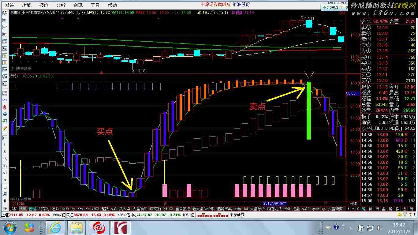 Z:=5;N:=10; HIGH1:=IF(HIGH<REF(H,1),(H+L)*0.5,HIGH); LOW2:=IF(LOW>=(REF(L,1)+REF(L,2))/2,CLOSE,LOW); LOW1:=IF(LOW>=REF(LOW,1),CLOSE,LOW); CLOSE1:=IF(CLOSE>=REF(CLOSE,1),CLOSE,(HIGH1+LOW2)*0.5); VARA:=IF(CLOSE=CLOSE,(CLOSE+LOW+OPEN+HIGH+HIGH1+LOW2)/6,AMOUNT/(100*VOL)); VARU1:=LLV(LOW1,30); VARA1:=HHV(HIGH1,30); VARU2:=LLV(LOW1,21); VARA2:=HHV(HIGH1,21); CC:=MA((VARA-VARU2)/(VARA2-VARU2)*100,11); CC1:=EMA(CC,7),COLOR336699; B:=EMA((VARA-VARU1)/(VARA1-VARU1)*105,13); B1:=EMA(B,8); 移动平均A:STICKLINE(B-B1>0 ,B*1.03,B1,3,1),COLOR3366AA; 移动平均B:STICKLINE(B-B1<=0,B*1.03,B1,3,1),COLOR779966; VAR44:=ZIG(3,Z); RSV:=(VAR44-LLV(VAR44,N))/(HHV(VAR44,N)-LLV(VAR44,N))*100; 月MD:="KDJ.D#MONTH",COLORFF0000,LINETHICK2; 月MK:="KDJ.K#MONTH",COLOREECC00;周CD:="KDJ.D#WEEK",COLOR0000BB,LINETHICK2; 周CK:="KDJ.K#WEEK",COLOR0099FF; 月死KD:=MA((月MD,月MK),1); 周死KD:=MA((周CD,周CK),1); 周死RSI:="RSI.RSI2#WEEK"<="RSI.RSI3#WEEK"; 月金KD:=MA((月MK,月MD),1); 周金KD:=MA((周CK,周CD),1); 周金RSI:="RSI.RSI2#WEEK">="RSI.RSI3#WEEK"*0.998; 周金R:="RSI.RSI1#WEEK">="RSI.RSI2#WEEK"; AA:=STICKLINE(月死KD && 周死KD && 周死RSI,100,50,0,1),COLOR998888; BB:=STICKLINE(月金KD && 周金KD && 周金RSI,0,50,0,1),COLOR8800DD; K:SMA(RSV,3,1),COLORAA9999,LINETHICK2; D:SMA(K,3,1),COLOR00AA00,LINETHICK2; J:=3*K-2*D,COLORFFAABB,LINETHICK1; STICKLINE(周CK<周CD,D,K*1.01,4.2,1),COLORFFCC00; STICKLINE(周CK>=周CD,D,K*1.01,4.2,1),COLOR0000FF; RMA2:=MA(MA("RSI.RSI2#MONTH",2),2),COLORGRAY,LINETHICK1; RMA3:=MA(MA("RSI.RSI3#MONTH",2),2),COLOR000099,LINETHICK1; STICKLINE(RMA2>=RMA3,D*0.999,K*1.03,0.8,0),COLOR0068FF; STICKLINE(RMA2<RMA3,D*0.999,K*1.03,0.8,0),COLORFF0044; A:=(3*CLOSE+LOW+OPEN+HIGH)/6; D1:=(20*A+19*REF(A,1)+18*REF(A,2)+17*REF(A,3)+16*REF(A,4)+15*REF(A,5)+14*REF(A,6) +13*REF(A,7)+12*REF(A,8)+11*REF(A,9)+10*REF(A,10)+9*REF(A,11)+8*REF(A,12) +7*REF(A,13)+6*REF(A,14)+5*REF(A,15)+4*REF(A,16)+3*REF(A,17)+2*REF(A,18)+ REF(A,20))/211; D2:=EMA(D1,2); D3:=EMA(D2,2); K1:=EMA(D3,2); 卖转向:STICKLINE(PEAKBARS(3,15,1)=1,101,51,1.6,0),COLOR00FF44,LINETHICK2; 买转向:STICKLINE(TROUGHBARS(3,15,1)=0 AND HIGH>LOW+0.01,0,49,1.6,0),COLORAA00FF; 死叉RSI:=DRAWICON(CROSS(周CD,周CK) AND 周死RSI,99,2); 转向:=DRAWICON((CROSS(周CK,周CD) AND 周金RSI),25,5); 月金叉:=月MK>月MD; 月周金叉:=IF(CROSS(周CK,周CD) AND 月金叉,31,0),LINETHICK1,COLOR3333FF; 周金叉RSI:=STICKLINE(CROSS("RSI.RSI2#WEEK","RSI.RSI3#WEEK"),0,25,3,0),COLOR0038FF; 金叉RSI:=DRAWICON(CROSS("RSI.RSI2#WEEK","RSI.RSI3#WEEK"),18,9); 波段升:STICKLINE(CROSS(D1,K1) AND CC>=CC1,1,33,0.1,0),COLOR00FFFF; 波段下:STICKLINE(CROSS(K1,D1) AND CC<CC1,98,68,0.1,0),COLORAAAAAA; DIFFR:=EMA(CLOSE,12)-EMA(VARA,26); DEAR:=EMA(DIFFR,9),COLORFFFFFF,LINETHICK1; MACDA:=EMA(CLOSE,12)-EMA(CLOSE,26); MACDD:=EMA(CLOSE,9)-EMA(CLOSE,12); MACDB:=EMA(CLOSE,9)-EMA(CLOSE1,12); MACDH:=EMA(CLOSE,12)-EMA(CLOSE1,26); MACDC:=EMA(CLOSE,8)-EMA(CLOSE1,15); MACDM:=EMA(CLOSE,7)-EMA(CLOSE,11); 中线持仓:=IF(CLOSE>=SAR(4,2,20),SAR(4,2,20),DRAWNULL); 中线空仓:=IF(CLOSE<SAR(4,2,20),SAR(4,2,20),DRAWNULL); DXB:=COUNT(CROSS(MACDM,0) OR CROSS(MACDD,0) OR CROSS(MACDA,0),15)>=2; DXC:=COUNT(CROSS(MACDM,0) OR CROSS(MACDD,0) OR CROSS(MACDA,0) OR CROSS(MACDH,0),20)>=2; DXD:=COUNT(CROSS(MACDM,0) OR CROSS(MACDC,0) OR CROSS(MACDH,0) OR CROSS(MACDB,0),20)>=2; DXE:=COUNT(CROSS(MACDM,0) OR CROSS(MACDH,0) OR CROSS(MACDB,0) OR CROSS(MACDD,0) OR CROSS(MACDA,0),30)>=4; MD:=BACKSET(DEAR>=REF(DEAR,1),2); STICKLINE((MACDD>0 OR MACDH>0) AND 中线持仓 ,0,7,3,1),COLOR0000FF; STICKLINE((MACDC>=0 OR MACDH>=0) AND 中线持仓 AND (DXB OR DXC OR DXD OR DXE) AND MD ,1,12,2.2,0),COLORCC88FF; STICKLINE((MACDD<=0 OR MACDC<=0) AND 中线空仓,100,94,3.8,1),COLORAA7777; MCST:=DMA(AMOUNT/(100*VOL),VOL/CAPITAL); DIF:=EMA(EMA(CLOSE,18)-EMA(CLOSE,34),11); MACD:=EMA(EMA(DIF,11),11),COLOR58FF58; DEF:=2*(DIF-MACD),COLORFFFF00,LINETHICK0; STICKLINE(C>=MCST,12,19,1,1),COLOR00EEFF;