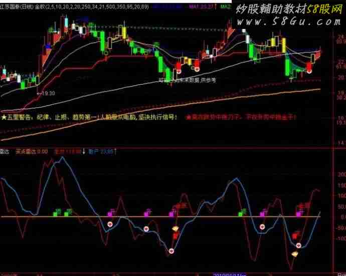 使用说明: 图中蓝线代表散户监控线,红线主力表示监控线; 当红线自下而上上穿蓝线时,表明市场场内资金做多力量逐渐增加,此时可适当关注; 当红线自上而下下穿蓝线时,表明市场场内资金做空力量逐渐增加,此时应注意市场风险。 当图中提示“顶”时,需要注意市场风险; 当图中提示“底”时,表明股价调整幅度相对较大,有反弹需求; 当图中在同一天显示 “底”和“升”时,个股短线见底概率较大。 当图中提示“升”时,表明股价已有极大幅度的调整,接下来涨升的可能性较大; 当出现"金底"信号时买入,后市涨升的概率极大; 3.指标只能做参考,决策还在自己!暴跌趋势下,慎用此公式作买入依据!!!LC:=REF(CLOSE,1);RSI1:=SMA(MAX(CLOSE-LC,0),6,1)/SMA(ABS(CLOSE-LC),6,1)*100;AR:=SUM(HIGH-OPEN,26)/SUM(OPEN-LOW,26)*100;卖点雷达:=CROSS(85,RSI1)*30,COLOR00FF00,LINETHICK2;DRAWTEXT(CROSS(85,RSI1),20,'顶'),COLOR00FF00;STICKLINE(卖点雷达,0,20,3,0),COLOR00FF00;VARB:=SMA(MAX(CLOSE-LC,0),7,1)/SMA(ABS(CLOSE-LC),7,1)*100;VARC:=SMA(MAX(CLOSE-LC,0),13,1)/SMA(ABS(CLOSE-LC),13,1)*100;VARD:=BARSCOUNT(CLOSE);买点雷达:(VARB< 20 AND VARC< 25 AND VARD> 50 AND AR<70)*30,LINETHICK2,COLOR0078FF;BT1:=CROSS(RSI1,25);DRAWTEXT(BT1,-80,'底'),COLOR0000FF;STICKLINE(BT1,-100,-80,3,0),COLOR0000FF;主力:EMA( (CLOSE-MA(CLOSE,7))/MA(CLOSE,7)*480,2)*5,LINETHICK1,COLOR0000FF;散户:EMA( (CLOSE-MA(CLOSE,11))/MA(CLOSE,11)*480,7)*5,LINETHICK2,COLORC87800;BT2:=CROSS(主力,散户) AND 主力<-10;DRAWICON(CROSS(RSI1,25),主力,26);DRAWICON(CROSS(主力,散户) AND 主力<-10,主力,23);BT:=FILTER(COUNT(BT1 OR BT2,3)>=2,3);STICKLINE(BT,0,50,4,1),COLOR0000FF;DRAWTEXT(BT,50,'金底'),COLOR0000FF;STICKLINE(BT2,0,20,3,0),COLORFF00FF;DRAWTEXT(BT2,20,'升'),COLORFF00FF; |