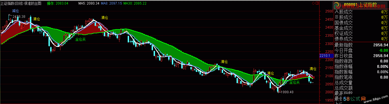 上线:=SMA(C,6.5,1); 下线:=SMA(C,13.5,1); 上线1:=SMA(C,3,1); 下线1:=SMA(C,8,1);{STICKLINE(上线>下线 , 上线,下线 ,0.1, 0),COLORRED,LINETHICK1; STICKLINE(下线>上线,上线,下线,0.1,0),COLORYELLOW,LINETHICK1;} DRAWTEXT( CROSS(上线,下线),LOW *0.98,'.全仓买'),COLOR00FF00; DRAWTEXT(CROSS(下线1,上线1),H*1.02,'.清仓'),COLORYELLOW; BBI:=(MA(CLOSE,3)+MA(CLOSE,6)+MA(CLOSE,12)+MA(CLOSE,24))/4; UPR:=BBI+3*STD(BBI,13),LINETHICK2; DWN:=BBI-3*STD(BBI,13); 安全:=MA(CLOSE,60),LINETHICK2; LC:=REF(CLOSE,1); RSI:=SMA(MAX(CLOSE-LC,0),6,1)/SMA(ABS(CLOSE-LC),6,1)*100; DRAWTEXT( CROSS(82,RSI) , HIGH*1.02,'减仓') ,COLORFF9966,LINETHICK2; A7:=(2*C+H+L)/4; 操作:MA(A7,5),LINETHICK2; 操作1:=MA(A7,5)*1.03,LINETHICK2; 操作2:=MA(A7,5)*0.97,LINETHICK2; VAR1:=LLV(A7,21); VAR2:=HHV(A7,21);SK:=EMA((A7-VAR1)/(VAR2-VAR1)*100,7); SD:=EMA(0.667*REF(SK,1)+0.333*SK,5); DRAWTEXT(IF(COUNT(CLOSE<REF(CLOSE,1),8)/8>6/10 AND VOL>=1.5*MA(VOL,5) AND COUNT(SK>=SD,3) AND REF(LOW,1)=LLV(LOW,120),1,0),LOW*0.98,'.买进') ,COLOR0099FF; DRAWTEXT(IF(COUNT(CLOSE<REF(CLOSE,1),13)/13>6/10 AND COUNT(SK>SD,6) AND REF(LOW,5)=LLV(LOW,120) AND REF(CLOSE>=OPEN,4) AND REF(CLOSE>OPEN,3) AND REF(CLOSE>OPEN,2) AND REF(OPEN>CLOSE,1) AND OPEN>REF(CLOSE,1),1,0),LOW*0.98,'.买进') ,COLORYELLOW; D:=MA(CLOSE,80)-MA(CLOSE,10)/3; DRAWTEXT(IF(CLOSE<D AND VOL/240>MA(VOL,5)/240 AND CLOSE>REF(CLOSE,1)*1.08 AND CLOSE<MA(CLOSE,13)*1.3,1,0),LOW*0.98,'.抄底'),COLORYELLOW;STICKLINE( MA(CLOSE,8)>MA(CLOSE,30),MA(CLOSE,8),MA(CLOSE,30),8,0),COLOR000088; STICKLINE( MA(CLOSE,8)<MA(CLOSE,30),MA(CLOSE,8),MA(CLOSE,30),8,0),COLOR008800; DRAWKLINE(H,O,L,C); MA5:MA(CLOSE,5),COLORWHITE,LINETHICK2; MA8:MA(CLOSE,8),COLORFF9966,LINETHICK2; MA30:MA(CLOSE,30),COLORGREEN,LINETHICK2;