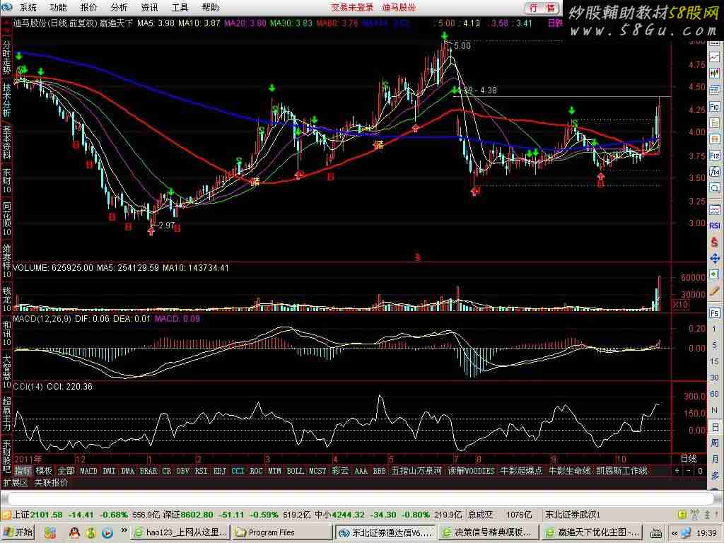 MA5:MA(CLOSE,5); MA10:MA(CLOSE,10); MA20:MA(CLOSE,20); MA30:MA(CLOSE,30); MA60:MA(CLOSE,60),COLORRED,LINETHICK2; MA144:MA(CLOSE,144),LINETHICK2; 清仓:=1.66*MA(FORCAST(CLOSE,2),40); 出货:=1.36*MA(FORCAST(CLOSE,2),40); 高抛:=1.16*MA(FORCAST(CLOSE,2),40); 低吸:=0.82*MA(FORCAST(CLOSE,2),40); 满仓:=0.72*MA(FORCAST(CLOSE,2),40); 强通1:=清仓>REF(清仓,1); 强通2:=出货>REF(出货,1); 强通3:=高抛>REF(高抛,1); 强通4:=低吸>REF(低吸,1); 强通5:=满仓>REF(满仓,1); 上升通道:=强通1 AND 强通2 AND 强通3 AND 强通4 AND 强通5,; 五强:=MA5>REF(MA5,1); 十强:=MA10>REF(MA10,1); 二十强:=MA20>REF(MA20,1); 三十强:=MA30>REF(MA30,1); 六十强:=MA60>REF(MA60,1); 小均强:=五强 AND 十强; 均强:=十强 AND 二十强 AND 三十强; 大均强:=十强 AND 二十强 AND 三十强 AND 六十强; JJD:=(H+L+C)/3; 强势线1:=HHV(MA((((LOW + HIGH) + CLOSE) / 3),8),60); 强势线2:=HHV(MA((((LOW + HIGH) + CLOSE) / 3.18),8),20); 强势线3:=HHV(MA((((LOW + HIGH) + CLOSE) / 3.258),8),10); 强势线4:=HHV(MA((((LOW + HIGH) + CLOSE) / 3.08),80),13); 开始走强1:=强势线1>REF(强势线1,1); 开始走强2:=强势线2>REF(强势线2,1); 开始走强3:=强势线3>REF(强势线3,1); 开始走强4:=强势线4>REF(强势线3,1); 双强1:=开始走强1 AND 开始走强2; 双强2:=开始走强2 AND 开始走强3; 双强3:=开始走强2 AND 开始走强3; 双强4:=开始走强3 AND 开始走强4; 三强:=开始走强1 AND 开始走强2 AND 开始走强3; 四强:=开始走强1 AND 开始走强2 AND 开始走强3 AND 开始走强4; 强势为王:=双强1 OR 双强2 OR 双强3 OR 双强4 OR 三强 OR 四强; VV:=(C+L+H)/3; DSA:=SMA(XMA(VV,15),2,1); 顶部1:=DSA*1.0888; 顶部2:=DSA*1.158; 顶部3:=DSA*1.218; 底部1:=DSA*0.9518; 底部2:=DSA*0.888; 底部3:=DSA*0.8; 五日走强:=MA5>REF(MA5,1); 十日走强:=MA10>REF(MA10,1); 二十日走强:=MA20>REF(MA20,1); 六十日走强:=MA60>REF(MA60,1); 低位主升:=五日走强 AND 十日走强 AND 六十日走强; 主升浪:=五日走强 AND 十日走强 AND 二十日走强; 大主升浪:=十日走强 AND 二十日走强 AND 六十日走强; 大主升浪2:=五日走强 AND 十日走强 AND 二十日走强 AND 六十日走强; 总主升:=主升浪 AND 大主升浪 AND 大主升浪2; 总主升浪:=低位主升 OR 主升浪 OR 大主升浪 OR 大主升浪2 OR 总主升,; 强势主升低买:=L<底部1 AND 总主升浪 AND 强势为王 AND C<DSA; 猎股小王:=L<底部1 AND C<DSA AND 强势为王; DRAWICON(猎股小王>0,L*0.97,1); DRAWTEXT(猎股小王>0,L*0.97, '猎'),COLORYELLOW; 猎股大王出击:=强势主升低买 AND 猎股小王 AND H<DSA; A:=MA(C,30); A1:=A*1.1; A4:=A*0.9; A2:=A1-(A1-A4)*0.191; 持仓:=IF(HIGH*1.01>A2 OR REF(HIGH,1)>REF(A2,1),A1,A4); 生命线:=IF(HIGH*1.01>A2 OR REF(HIGH,1)>REF(A2,1),A2,A4); 主升持仓:=持仓>生命线,; 主升1:=持仓>REF(持仓,1),; 主升2:=生命线>REF(生命线,1),; 主升:=主升1 AND 主升2,; 主升猎股王:=(猎股大王出击 AND 主升持仓 AND 主升) OR (猎股小王 AND 主升持仓 AND 主升); 绝对的主升:=(主升猎股王 AND 小均强) OR (猎股小王 AND 小均强); DRAWICON(绝对的主升>0,L*0.97,1); Y1:=LLV(L,17); Y2:=SMA(ABS(L-REF(L,1)),17,1); Y3:=SMA(MAX(L-REF(L,1),0),17,2); Q:=-(EMA(IF(L<=Y1,Y2/Y3,-3),1)); VAR2:=EXPMA(EXPMA(EXPMA((2*CLOSE+HIGH+LOW)/4,4),4),4); 天:=( MA((VAR2-REF(VAR2,1))/REF(VAR2,1)*100,2)); 地:=( MA((VAR2-REF(VAR2,1))/REF(VAR2,1)*100,1)); 高兴:=STICKLINE(地>天 AND 地<0 AND ("KDJ.J"(9,3,3)>REF("KDJ.J"(9,3,3),1) AND"KDJ.D"(9,3,3)<20 AND "KDJ.J"(9,3,3)<20) AND V=LLV(V,10) AND IF(CROSS(Q,0),1,0),10,0,1,0)=1,COLORRED; DRAWICON(高兴,L*0.915,1); DRAWTEXT(高兴,L*0.915, '兴'),COLORYELLOW; HIGHN:=10;LOWN:=10;HIGHDISPLAY:=0;LOWDISPLAY:=0;ZGDISPLAY:=0;MADISPLAY:=0; AA:=REF(H,HIGHN)=HHV(H,2*HIGHN+1); QY:=BACKSET(AA,HIGHN+1); CC:=FILTER(QY,HIGHN) AND H=HHV(H,HIGHN+1); DRAWICON(CC,H*1.02,2); DDD:=BARSLAST(CC); GDTS:=IF(CC,CURRBARSCOUNT,0); DINGBU:=IF(DDD,REF(H,DDD),H);{顶部} DINGBUTS:=IF(DDD,REF(GDTS,DDD),GDTS); DINGBU1:=REF(DINGBU,DDD+1); GDCS1:=CONST(DINGBUTS); DINGBUTS1:=REF(DINGBUTS,DDD+1); GDCS2:=CONST(DINGBUTS1); DINGBU2:=REF(DINGBU1,DDD+1); MM:=IF(CURRBARSCOUNT>GDCS2,0,1); 高压:=DRAWLINE(CURRBARSCOUNT=GDCS2,H,CURRBARSCOUNT=GDCS1,H,1) COLORFF00FF,LINETHICK1; DRAWLINE(CURRBARSCOUNT=GDCS2,H,ISLASTBAR,REF(H,GDCS2-1),1),COLOR0055FF,POINTDOT; DRAWLINE(CURRBARSCOUNT=GDCS1,H,ISLASTBAR,REF(H,GDCS1-1),1),COLORYELLOW,POINTDOT; AA1:=REF(L,LOWN)=LLV(L,2*LOWN+1); QY1:=BACKSET(AA1,LOWN+1); CC1:=FILTER(QY1,LOWN) AND L=LLV(L,LOWN+1); DRAWICON(CC1,L*0.98,1); DD1:=BARSLAST(CC1); DDTS:=IF(CC1,CURRBARSCOUNT,0); YDB:=IF(DD1,REF(L,DD1),L); DDTS1:=IF(DD1,REF(DDTS,DD1),DDTS); DDCS1:=CONST(DDTS1); ZDB:=REF(YDB,DD1+1); DDTS2:=REF(DDTS1,DD1+1); DDCS2:=CONST(DDTS2); 低支:=DRAWLINE(CURRBARSCOUNT=DDCS2,L,CURRBARSCOUNT=DDCS1,L,1) COLORFF00FF,LINETHICK1; ZGSTAR:=(高压+低支)/2; ZGEND:=CONST((高压+低支)/2); STARDAY:=IF(DDCS2<GDCS2,DDCS2,GDCS2); 中轨:=DRAWLINE(CURRBARSCOUNT=STARDAY,ZGSTAR,ISLASTBAR,ZGEND,1),COLORFF00FF,LINETHICK1; DRAWLINE(CURRBARSCOUNT=DDCS1,L,ISLASTBAR,REF(L,DDCS1-1),1),COLORMAGENTA,POINTDOT,; DRAWLINE(CURRBARSCOUNT=DDCS2,L,ISLASTBAR,REF(L,DDCS2-1),1),COLORCYAN,POINTDOT; CBFB:=COSTEX(C,REF(C,1)); JL:=IF(C>CBFB,V,0); CL:=IF(C<CBFB,V,0); JLH:=SUM(JL,4); CLH:=SUM(CL,4); LHB:=CLH/JLH; TJ1:=IF(HHV(LHB,5)>4 AND CROSS(2,LHB) AND C>=O,1,0); {DRAWICON(TJ1,L*0.93,1); DRAWTEXT(TJ1,L*0.93, '钱'),COLORYELLOW;} N:=5; VAR1:=4*SMA((CLOSE-LLV(LOW,N))/(HHV(HIGH,N)-LLV(LOW,N))*100,5,1)- 3*SMA(SMA((CLOSE-LLV(LOW,N))/(HHV(HIGH,N)-LLV(LOW,N))*100,5,1),3.2,1),COLORYELLOW,LINETHICK0; V3:=(CLOSE-LLV(LOW,8))/(HHV(HIGH,8)-LLV(LOW,8))*100; 操盘线:=SMA(V3,2,1); V5:=SMA(操盘线,2,1); 赢尽天下抄底:=IF(操盘线>REF(操盘线,1) AND REF(操盘线,1)<REF(操盘线,2) AND 操盘线<23 ,25,0) AND CROSS(VAR1,8); {DRAWICON(赢尽天下抄底,L*0.86,1); DRAWTEXT(赢尽天下抄底,L*0.86, '底'),COLORYELLOW;} MA62:=MA(C,62)COLORCC3299,LINETHICK1 ; MA133:=MA(C,13