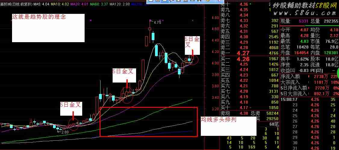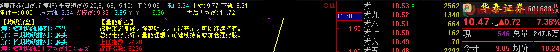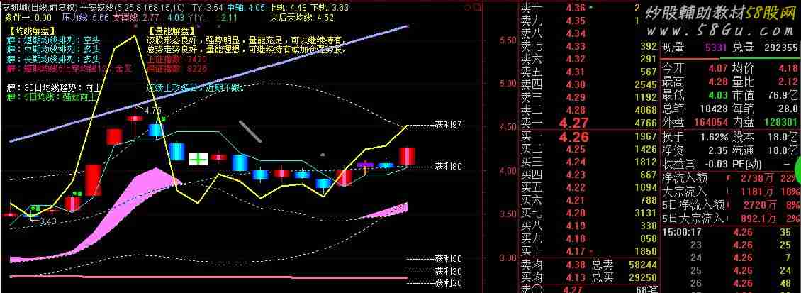 大道至简(四)-强势选股-源码无未来函数。 大家总觉得选股很难。千方百计找一些特别公式进行筛选。其实不必那么麻烦。用通达信本身的指标一样选出强势股。 只要在自己选中的波段中再选出强势股即可 回归自然的源码-----多头排列+5日均线上穿10均线 再给童鞋们一个忠告!!!选出的股收盘价离各类压力线.布林顶线.轨道顶线越远越好。反之离各类支撑线.布林底线.轨道底线越近越好{N(1,100,5)N1(1,100,10)N2(1,100,30)N3(1,100,60)}A1:=MA(CLOSE,N);A2:=MA(CLOSE,N1);A3:=MA(CLOSE,N2);A4:=MA(CLOSE,N3);多头排列:=CLOSE>A1 AND A1>A2 AND A2>A3 AND A3>A4 AND CLOSE>OPEN;金叉5日:=CROSS(A1,A2);XG:多头排列&&金叉5日&&DYNAINFO(14)>=0.03&&C<=50&&C>=3;