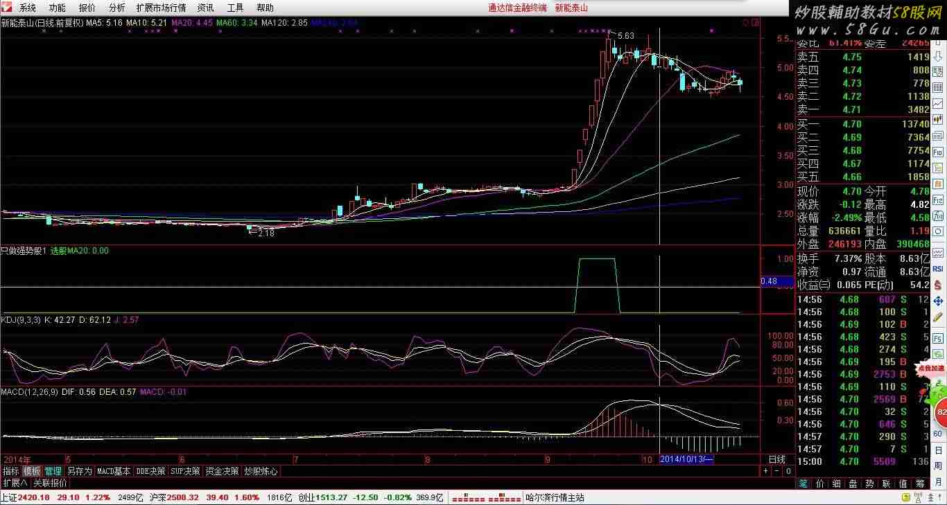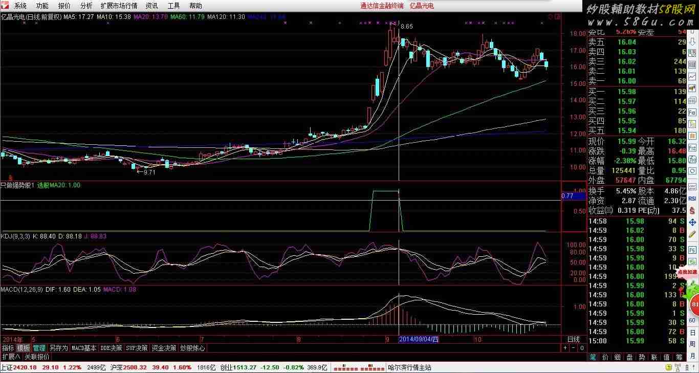 MA3:=MA(C,3);MA5:=MA(C,5);MA10:=MA(C,10);MA20:=MA(C,20);V0:=MA(C,3)>REF(MA(C,3),1) AND MA(C,5)>REF(MA(C,5),1) AND C>MA(C,3)AND MA(C,3)>MA(C,5) ; {均线C,MA3,MA5多头排列并向上;}角度MA3:=ATAN((MA3/REF(MA3,1)-1)*100)*180/3.1416;角度MA5:=ATAN((MA5/REF(MA5,1)-1)*100)*180/3.1416;角度MA10:=ATAN((MA10/REF(MA10,1)-1)*100)*180/3.1416;角度MA20:=ATAN((MA20/REF(MA20,1)-1)*100)*180/3.1416;选股MA20:IF(角度MA3>45 AND 角度MA5>45 AND 角度MA10>60 AND 角度MA20>45 AND MA(C,250)>REF(MA(C,250),1),1,0),COLOR00FF00;  |