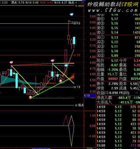 {突破回调买8副}X:=C=HHV(C,20); D:=BARSLAST(X); XD:=IF(D>0,REF(C,D),REF(C,D)); JC:=CROSS(C,REF(XD,1)); 突破1:=JC AND COUNT(JC,5)=1,COLORYELLOW;强势股:=H/REF(L,1)>1.15 OR H/REF(L,2)>1.18; 回调:=L/REF(H,1)<0.96 AND C<REF(C,1); 买入:REF(强势股,1) AND 回调;N:=3; TY:=H; AA1:=REF(TY,N)=HHV(TY,2*N+1); BA1:=FILTER(AA1,N); CA1:=BACKSET(BA1,N+1); HD:=FILTER(CA1,N); AA2:=REF(TY,N)=LLV(TY,2*N+1); BA2:=FILTER(AA2,N); CA2:=BACKSET(BA2,N+1); LD:=FILTER(CA2,N); 前高:=REF(H,BARSLAST(HD)),COLORRED,NODRAW; 突破:突破1 AND C>前高,COLORRED; 突破回调买:IF(COUNT(突破,5)=1 AND 突破=0 AND 买入 AND C>前高,-2,0),COLORYELLOW;