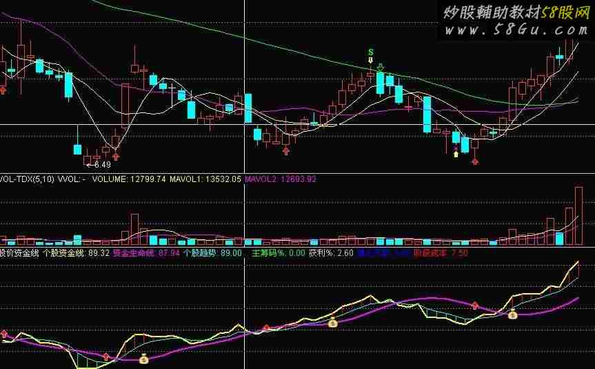 股价资金线 个股资金线:MA(C,1)/MA(REF(C,18),18)*100,LINETHICK2,COLOR00FFFF; 资金生命线:MA(FORCAST(个股资金线,20),6),COLORMAGENTA,LINETHICK2; 个股趋势A:=EXPMEMA(个股资金线,1),COLORCYAN,LINETHICK1; 个股趋势: EXPMEMA(个股趋势A,5),COLORCYAN,LINETHICK1; 升量:=个股资金线-个股趋势; 跌量:=个股趋势-个股资金线; STICKLINE(升量>0,个股趋势,个股资金线,0.0,0),COLORRED; STICKLINE(跌量>0,个股资金线,个股趋势,0.0,0),COLORGREEN; SVOL:=INTPART(SUM(V,0)/CAPITAL); TJ0:=SVOL>REF(SVOL,1) OR BARSSINCE(CLOSE)=0; S1:=BARSLAST(TJ0)+1; TJ2:=S1<REF(S1,1); S2:=IF(TJ2,REF(S1,1)+1,S1); S3:=SUM(TJ2,0); ZK1:="KD.K#WEEK"(9,3,3); ZD2:="KD.D#WEEK"(9,3,3); Z,1:="MACD.DIF#WEEK"(12,26,9); ZA2:="MACD.DEA#WEEK"(12,26,9); 换手:=V/CAPITAL*100,LINETHICK0; JCD:=FILTER(CROSS(ZK1,ZD2) AND REF(ZD2,1)<30,13),NODRAW; 取点:=BARSLAST(JCD); 吸筹区:=IF(取点>0 AND 取点<61,取点,0); ZS1:=吸筹区; ZS2:=吸筹区+1; ZS3:=换手/5; ZSA:=IF(ZS1>0,SUM((ZS3),吸筹区+1),0),NODRAW; 主筹码%:ZSA,NODRAW; 获利%:EMA(WINNER(C)*100,2),NODRAW; 建仓天数:ZS1,NODRAW; 阶段总额(万):=SUM(AMOUNT/10000,S2)*100,NODRAW; 阶段总量(手):=SUM(V,S2)*100,NODRAW; 阶段成本:(阶段总额(万)/(阶段总量(手)/100)),COLORRED,NODRAW; P:=10;A:=5; N:=2.5; VAR2:=LLV(LOW,10); VAR3:=HHV(HIGH,25); 卖出:=14.5*N,COLORC6C600; 清仓:=17.5*N,COLORFF75FF; 动力线:= (EMA((CLOSE-VAR2)/(VAR3-VAR2)*4,4)*10-17.5)*N; 底部:=-15.5*N,COLOR70DB93; 关注:=-12.5*N,COLORYELLOW; T1:=FILTER(CROSS(动力线,关注),20); T2:=FILTER(CROSS(动力线,底部),20); T3:=FILTER(CROSS(清仓,动力线),20); T4:=FILTER(CROSS(卖出,动力线),20); RSV:=((((HHV(HIGH,P) - CLOSE) / (HHV(HIGH,P) - LLV(LOW,P))) * 200) - 125); 散户:=SMA(RSV,A,1)+15,COLORGRAY,LINETHICK2; RSV1:=((((CLOSE - LLV(LOW,P)) / (HHV(HIGH,P) - LLV(LOW,P))) * 200) - 105); 主力:=SMA(RSV1,A,1)+15,COLORGRAY,LINETHICK2; 起爆:=CROSS(主力,散户),NODRAW; DRAWICON((T1 OR T2),资金生命线 ,1); DRAWICON(起爆,资金生命线,9);