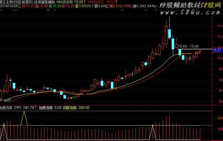 MID:=REF(HIGH+LOW,1)/2;CR1:SUM(MAX(0,HIGH-MID),30)/SUM(MAX(0,MID-LOW),30)*100,COLORSTICK;加速选股:IF(EVERY(EMA(C,12)>EMA(C,50),13) AND REF(EVERY(CR1<200,20),1) AND CROSS(CR1,200),CR1,0);回踩选股:IF(FILTER(EVERY(EMA(C,12)>EMA(C,50),20) AND CROSS(200,CR1) AND EXIST(CROSS(CR1,200),7),20),400,200); |