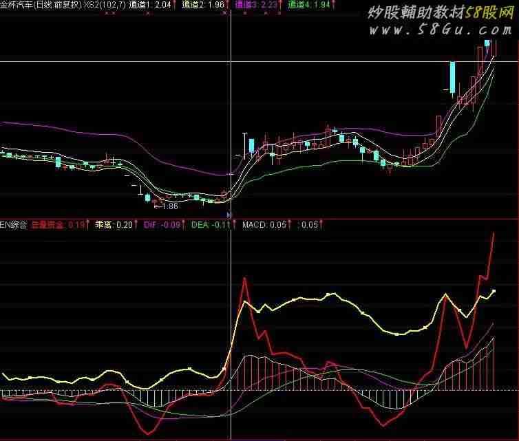 VAR1:=(HIGH+LOW+CLOSE*2)/4; VAR2:=EMA(VAR1,21); VAR3:=STD(VAR1,21); VAR4:=((VAR1-VAR2)/VAR3*100+200)/4; VAR5:=(EMA(VAR4,89)-25)*1.56; VAR6:=EMA(VAR5,5)*1.22; VAR7:=EMA(VAR6,3); VAR8:=3*VAR6-2*VAR7; VAR1A:=IF(CROSS(VAR6,VAR8) AND CROSS(VAR7,VAR8) AND CROSS(VAR7,VAR6),1,0); VAR1B:=EMA(CLOSE,3)-EMA(CLOSE,89); VAR1C:=EMA(VAR1B,21); VAR1D:=(VAR1B-VAR1C)*10; VAR1F:=POW(VAR1D,3)*0.1+POW(VAR1D,2); 主力资金:=IF(VAR1D>0.015,VAR1F,0)/45,COLORMAGENTA; VAR9:=EMA(CLOSE,2)-EMA(CLOSE,55); VAR10:=EMA(VAR9,13); VAR11:=2*(VAR9-VAR10); 总量资金:POW(VAR11,3)*0.1+POW(VAR11,1),LINETHICK2,COLORRED;乖离:EMA(100*(C-LLV(LOW,28))/(HHV(H,28)-LLV(LOW,28)),3)/(200),LINETHICK2,COLORYELLOW;DIF:EMA(CLOSE,12)-EMA(CLOSE,26); DEA:EMA(DIF,9); MACD:(DIF-DEA)*2,COLORSTICK;MACD,COLORWHITE;