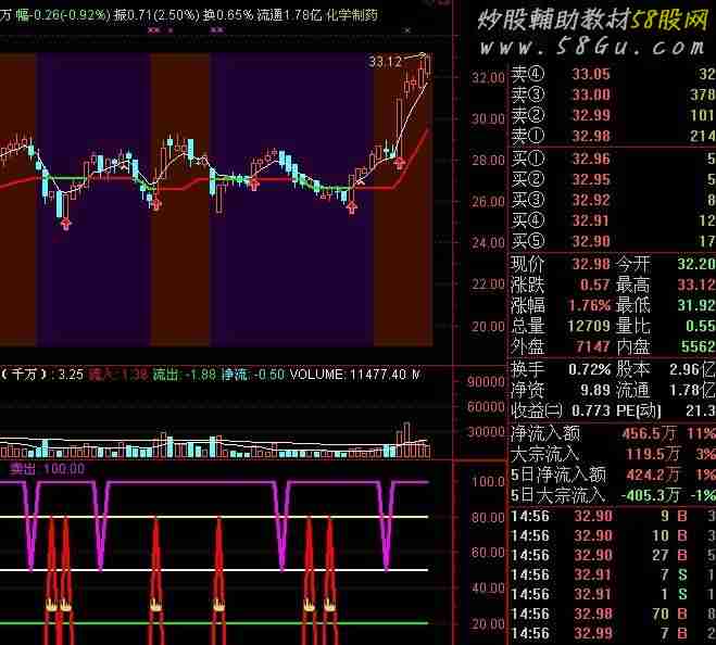 N1:=3;N2:=7;N3:=21; LC:=REF(CLOSE,1); RSI1:=SMA(MAX(CLOSE-LC,0),N1,1)/SMA(ABS(CLOSE-LC),N1,1)*100; RSI2:=SMA(MAX(CLOSE-LC,0),N2,1)/SMA(ABS(CLOSE-LC),N2,1)*100; RSI3:=SMA(MAX(CLOSE-LC,0),N3,1)/SMA(ABS(CLOSE-LC),N3,1)*100; 底部区域:20,COLORGREEN,LINETHICK2; 分界线:50,COLORWHITE,LINETHICK2; 风险区域:80,COLORYELLOW,LINETHICK2; ZB1:=RSI1<底部区域; 建仓:IF(CROSS(RSI1,底部区域) ,80,0),COLORRED,LINETHICK3; DRAWICON(CROSS(RSI1,底部区域) ,30,11); ZB2:=(ZB1=0 AND RSI1<=风险区域); 卖出:IF(ZB2=1 AND REF(ZB2,1)=0 AND 建仓=0,50,100),COLORMAGENTA,LINETHICK3; |
