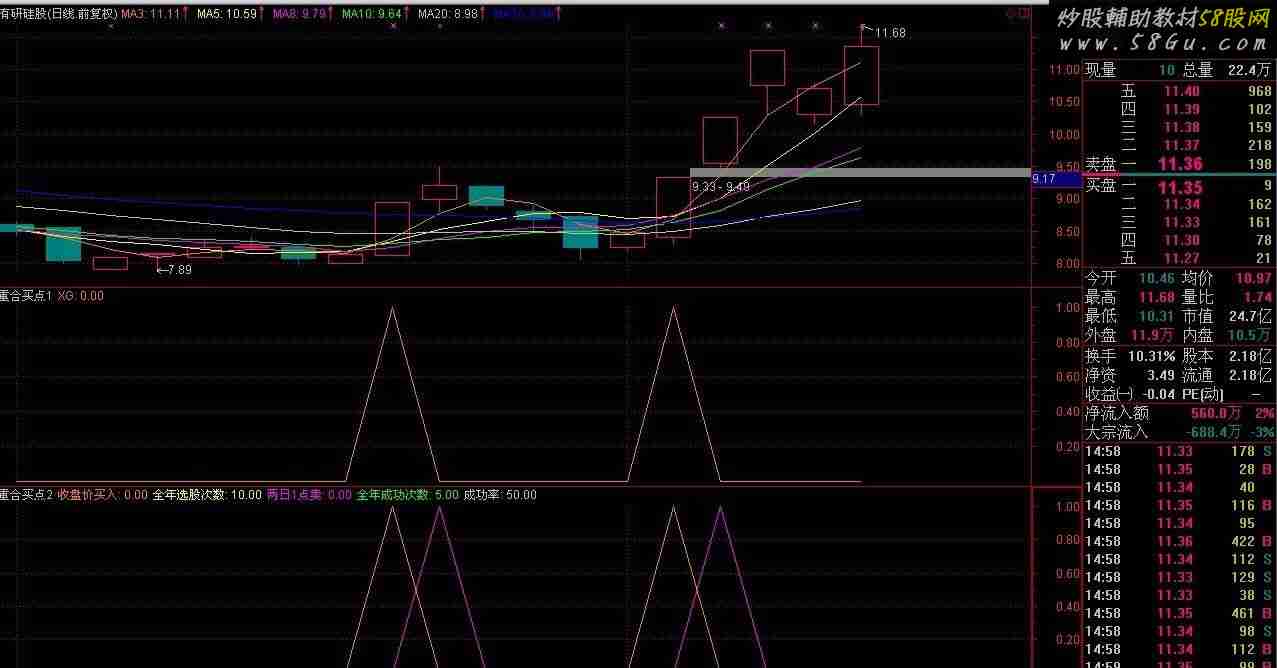 XD:=C-MA(C,7); CD:=SUM(XD,21); VAR1:=AMOUNT/VOL/7; VAR2:=(3*HIGH+LOW+OPEN+2*CLOSE)/7; VAR3:=SUM(AMOUNT,10)/VAR1/7; VAR4:=DMA(VAR2,VOL/VAR3); LZ:=(CLOSE-VAR4)/VAR4*100; XG:CROSS(LZ>CD,0.99);持股:=HHV(MA(C,17),2); FFS:=IF(MA(C,17)<持股,(MA(C,17)-(持股-MA(C,17))),持股); CG:=MA(C,17); DD:=FFS=持股 AND 持股=CG; JRS:=FILTER(DD=1,5); 搏杀:=HHV(MA(C,17),2); FS:=IF(MA(C,17)<搏杀,(MA(C,17)-(搏杀-MA(C,17))),搏杀); CGC:=MA(C,17); XXG:=搏杀=FS AND FS=CGC; BBB:=TFILTER(XXG,1,5); A01:=CROSS(XXG,BBB); 收盘价买入:CROSS(A01,0.8) AND CROSS(JRS,0.8); 全年选股次数:SUM(收盘价买入,250),LINETHICK0,NODRAW; 两日1点卖:HHV(H,3)>REF(C,1)*1.02 AND REF(CROSS(收盘价买入,0.8),1); 全年成功次数:SUM(两日1点卖,250),LINETHICK0,NODRAW; 成功率:(全年成功次数/全年选股次数)*100,LINETHICK0,NODRAW; |