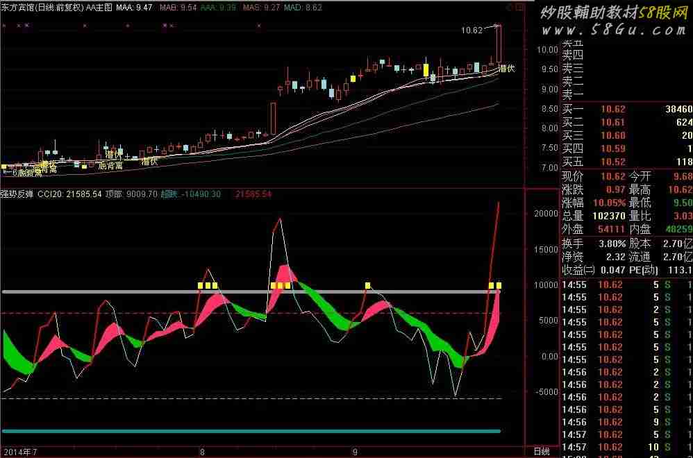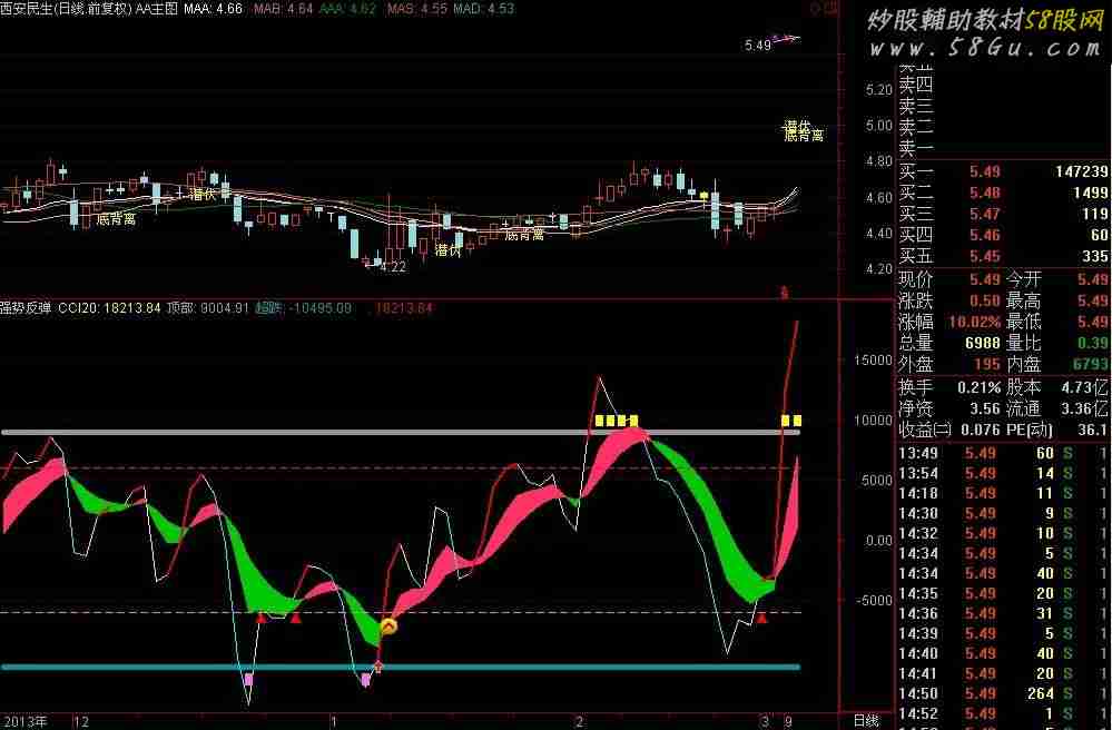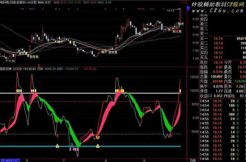 QWX1:=HHV(CLOSE,30);QWX2:=LLV(CLOSE,30);QWX3:=CONST((QWX1+QWX2)/2);TYP:=(HIGH+LOW+CLOSE)/3;CCI20:((TYP-MA(TYP,14))/(0.015*AVEDEV(TYP,14)))*60+QWX3, COLORYELLOW;K:=SMA(CCI20,3,1);D:=SMA(K,3,1);LJ2:=((C-LLV(LOW,8))/(HHV(HIGH,8)-LLV(LOW,8))*100)*60+QWX3;LJF2:=(EMA(LJ2,3));顶部:150*60+QWX3,COLOR999599,LINETHICK5;超跌:-175*60+QWX3,COLOR999500,LINETHICK5;DRAWBAND(K,RGB(255,50,100),D,RGB(0,200,0));IF(CCI20<REF(CCI20,1),CCI20,DRAWNULL),COLORFFFF00,LINETHICK1;IF(CCI20>REF(CCI20,1),CCI20,DRAWNULL),COLOR0000EA,LINETHICK2; STICKLINE(CCI20<=-185*60+QWX3,-185*60+QWX3,-200*60+QWX3,2,0),COLOREE77EE; STICKLINE(CCI20>=150*60+QWX3,158*60+QWX3,172*60+QWX3,2,0),COLOR00FFFF; 强势买入:STICKLINE(C,100*60+QWX3,100*60+QWX3,-1,0),COLORLIMAGENTA;反弹买入:STICKLINE(C,-100*60+QWX3,-100*60+QWX3,-1,0),COLOR0099FF;DRAWICON(CROSS(CCI20,-170*60+QWX3) AND LJF2<18*60+QWX3,-175*60+QWX3,1);DRAWICON(CROSS(CCI20,-100*60+QWX3) AND CROSS(K,D),-121*60+QWX3,34);DRAWICON(CROSS(CCI20,-100*60+QWX3) AND K>-100*60+QWX3,-111*60+QWX3,38);DRAWICON(CROSS(CCI20,-100*60+QWX3) AND K>-100*60+QWX3 AND CROSS(LJF2,18*60+QWX3),-175*60+QWX3,9);  |