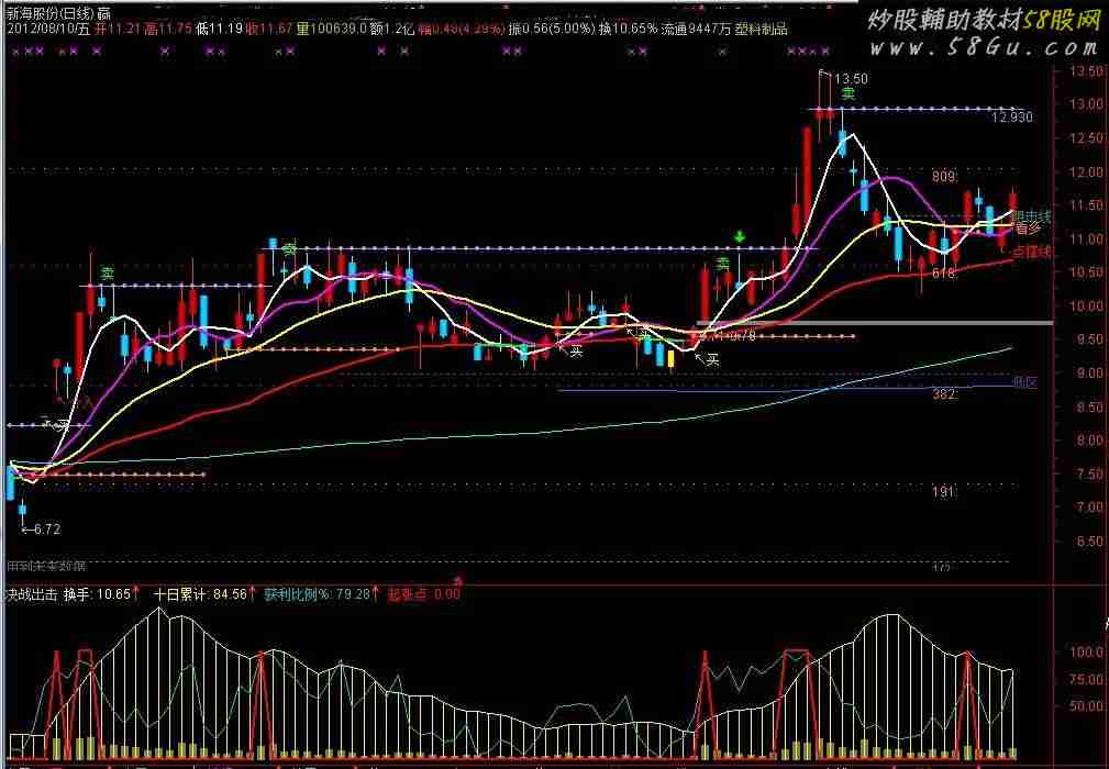 换手:VOL/CAPITAL*100,NODRAW; 十日换手:=SUM(换手,10),NODRAW; STICKLINE(C,0,换手,2,0),COLOR408080; 十日累计:SUM(换手,10),LINESTICK; 换手率%:=VOL/CAPITAL*100,LINETHICK0,COLORYELLOW; 量比:=V/(REF(MA(V,5),1)),LINETHICK0,COLORRED; VVOL:=IF(CURRBARSCOUNT=1 AND PERIOD=5,VOL*240/FROMOPEN,DRAWNULL),NODRAW; 虚拟量比:=VVOL/(REF(MA(V,5),1)),LINETHICK0,COLORRED; 获利比例%:WINNER(C)*100,COLORLIBLUE; 涨幅%:=(C-REF(C,1))/REF(C,1)*100,LINETHICK0; 换手率%1:=换手率%>5; 量比1:=量比>1.5 OR 虚拟量比>1.5; 获利比例%1:=获利比例%>70; 涨幅%1:=涨幅%>3; 启动:=换手率%1 AND 量比1 AND 获利比例%1 AND 涨幅%1 ; 起涨点:IF(启动,101,0)COLORRED,LINETHICK2;