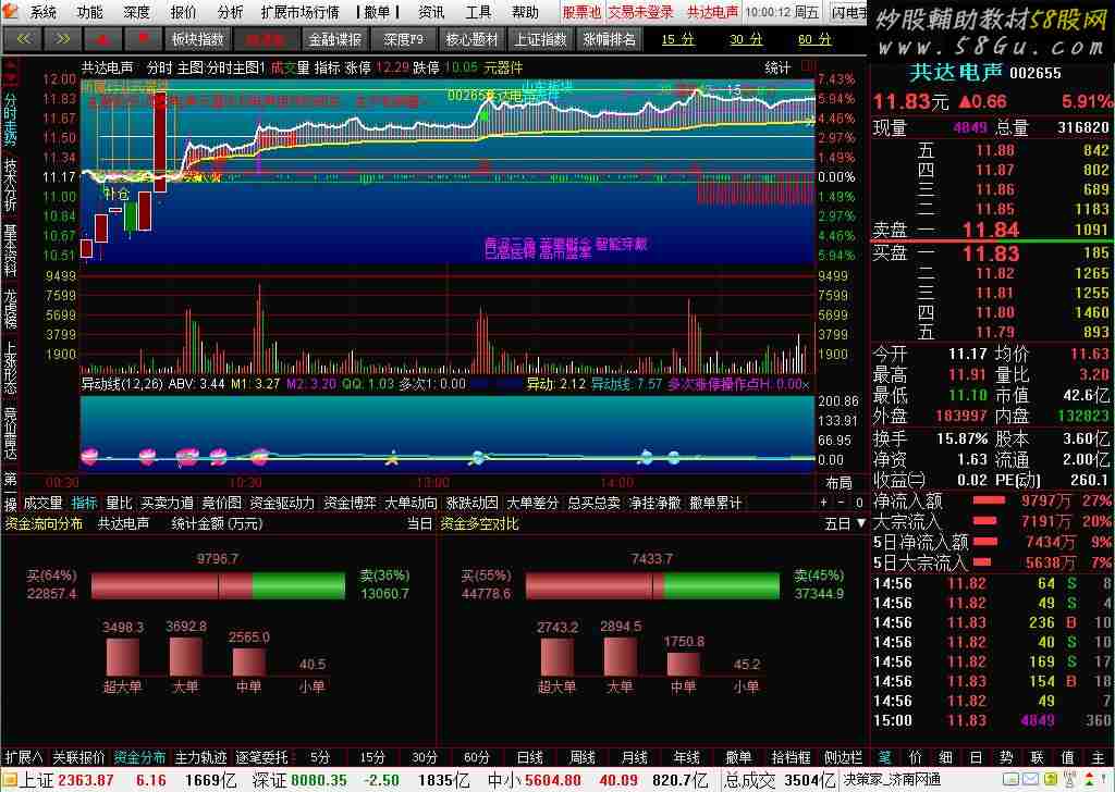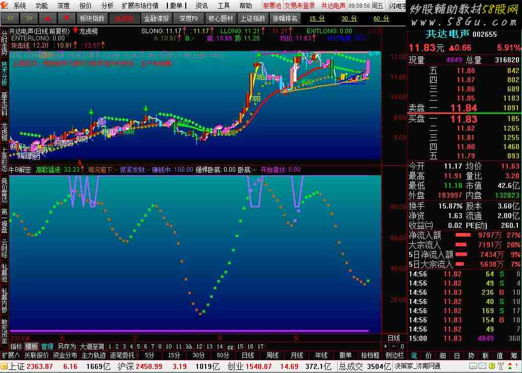 紧跟机构——最简单的选股方法 ——牛B解密两公式紧跟机构——最简单的选股方法{牛B解密 条件选股预警公式}开盘价大于:=O>REF(H,1) OR O>REF(L,1);去新股:=IF(NAMELIKE('N'),0,1);{刚上市不久的新股}一字涨停:=C/REF(C,1)>1.0975 AND H=O;涨幅度:=9.2;涨幅度1:=1;限制涨幅:=DYNAINFO(14)*100>涨幅度1 AND DYNAINFO(14)*100<涨幅度 AND CLOSE>MA(C,55);去除ST股:=IF(NAMELIKE('S'),0,1);去除星股:=IF(NAMELIKE('*'),0,1);去除停牌:=DYNAINFO(8)>0;ST:=去除ST股 AND 去除星股 AND 去除停牌;条件:=DYNAINFO(17)>0 AND ST AND C>=5.58 AND DYNAINFO(23)<>DYNAINFO(22)AND C<17.86 AND CAPITAL/1000000<6.63 AND 去新股 AND NOT(一字涨停) AND 限制涨幅AND IF(CODELIKE('300'),0,1) ;涨停板:=(C-REF(C,1))/REF(C,1)*100>=8.48 AND C>O;RN:=45; W:=1;只有一个:=COUNT(涨停板,RN)>=W;有涨板:=EXIST(只有一个,45)>=1;放量连扳:=COUNT(EVERY(C/REF(C,1)>1.08,3),60)=1AND COUNT(V/REF(V,1)>3,60)>=1;RT:=60; WT:=1;连扳:=COUNT(放量连扳,RT)>=WT;有连扳:=EXIST(连扳,60)=1;有扳:=有涨板 OR 有连扳;TJJ:=40;十天换手:=SUM(VOL/CAPITAL*100,10)>TJJ;获利比例:=WINNER(C)*100;ZF:=(C/REF(C,1)-1)*1000>40 AND C>O;涨停:=(C/REF(C,1)-1)*1000>95;获利盘:=获利比例>75 AND ZF;A1:=3*SMA((C-LLV(L,60))/(HHV(H,60)-LLV(L,60))*100,5,1)-2*SMA((C-LLV(L,60))/(HHV(H,60)-LLV(L,60))*100,5,1);别傻:=EMA(A1,5),LINETHICK1,COLORFF6600;A2:=(别傻-REF(别傻,1))/REF(别傻,1)*100+10,COLORFF0099;A3:=EMA(C,5);A4:=((C-LLV(L,20))/(HHV(H,20)-LLV(L,20)))*100;K20:=SMA(A4,6,1),LINETHICK1,COLOR33FF00;高歌猛进:=MA(2*SMA(A4,6,1)-SMA(SMA(A4,6,1),6,1),3);每况愈下:=IF(高歌猛进<REF(高歌猛进,1),高歌猛进,DRAWNULL);郜:=IF(LLV(K20,5)<10 AND (C=LLV(C,10) OR L=LLV(L,10)) AND C>REF(C,1)*0.905,40,0),COLOR0033FF;抓紧发财:=IF((HHV(A1,10)>90 OR HHV(高歌猛进,10)>88) AND (C=HHV(C,10) OR H=HHV(H,10)),高歌猛进,DRAWNULL);赚钱中:=IF((HHV(A1,10)>90 OR HHV(高歌猛进,10)>88) AND (C=HHV(C,10) OR H=HHV(H,10)),80,100),LINETHICK3,COLORFF6699;强悍卧底:=IF((A2<-3 OR LLV(K20,5)<10) AND (C=LLV(C,10) OR L=LLV(L,10)) AND C>REF(C,1)*0.905,30,0) OR 郜=40;卧底:=IF(强悍卧底=30,88,DRAWNULL);D8:=LLV(V,8);近三天持续缩量:=EVERY(D8=VOL,3) ;开始潜伏:=IF(HHV((MA(C,5)-C)/C,5)>0.07 AND HHV((MA(C,10)-MA(C,5))/MA(C,5),5)>0.05AND (C=LLV(C,10) OR L=LLV(L,10)) AND C<L*1.04 AND C>REF(C,1)*0.905,40,0),COLORF00FF0,LINETHICK3;出现:=赚钱中 OR 强悍卧底 OR 开始潜伏 AND近三天持续缩量 AND 高歌猛进>REF(高歌猛进,1)=1AND 高歌猛进>每况愈下 AND 十天换手 AND 有扳 AND 获利盘;EXIST(出现,7)>=1 AND DYNAINFO(14)*100>1.7AND C>0 AND 条件 AND 十天换手 AND 有扳 AND 获利盘; {牛B解密 副图公式}DRAWGBK(C>0,RGB(0,150,150),RGB(0,00,100),0,' ',0),LINETHICK2;A1:=3*SMA((C-LLV(L,60))/(HHV(H,60)-LLV(L,60))*100,5,1)-2*SMA((C-LLV(L,60))/(HHV(H,60)-LLV(L,60))*100,5,1);别傻:=EMA(A1,5),LINETHICK1,COLORFF6600;A2:=(别傻-REF(别傻,1))/REF(别傻,1)*100+10,COLORFF0099;A3:=EMA(C,5);A4:=((C-LLV(L,20))/(HHV(H,20)-LLV(L,20)))*100;K20:=SMA(A4,6,1),LINETHICK1,COLOR33FF00;高歌猛进:MA(2*SMA(A4,6,1)-SMA(SMA(A4,6,1),6,1),3),LINETHICK2,COLOR00FF00,CROSSDOT;每况愈下:IF(高歌猛进<REF(高歌猛进,1),高歌猛进,DRAWNULL),LINETHICK2,COLOR0066CC,CROSSDOT;郜:=IF(LLV(K20,5)<10 AND (C=LLV(C,10) OR L=LLV(L,10)) AND C>REF(C,1)*0.905,40,0),COLOR0033FF;抓紧发财:IF((HHV(A1,10)>90 OR HHV(高歌猛进,10)>88) AND (C=HHV(C,10) OR H=HHV(H,10)),高歌猛进,DRAWNULL),CROSSDOT,LINETHICK3,COLORFF6699;赚钱中:IF((HHV(A1,10)>90 OR HHV(高歌猛进,10)>88) AND (C=HHV(C,10) OR H=HHV(H,10)),80,100),LINETHICK3,COLORFF6699;强悍卧底:IF((A2<-3 OR LLV(K20,5)<10) AND (C=LLV(C,10) OR L=LLV(L,10)) AND C>REF(C,1)*0.905,30,0),LINETHICK2,COLORFFFFFF;卧底:IF(强悍卧底=30,88,DRAWNULL),CROSSDOT,LINETHICK3,COLORFFFFFF;DRAWICON(郜=40,40,9);开始潜伏:IF(HHV((MA(C,5)-C)/C,5)>0.07 AND HHV((MA(C,10)-MA(C,5))/MA(C,5),5)>0.05AND (C=LLV(C,10) OR L=LLV(L,10)) AND C<L*1.04 AND C>REF(C,1)*0.905,40,0),COLORF00FF0,LINETHICK3;