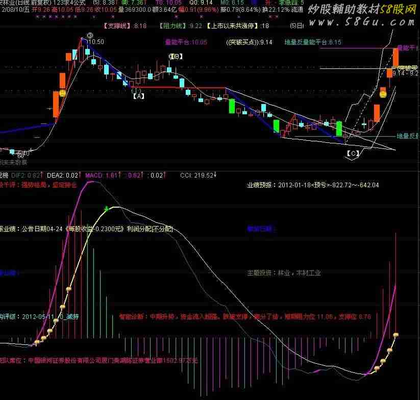 DIF2:EMA(CLOSE,8) - EMA(CLOSE,57),COLORLICYAN; DEA2:EMA(DIF2,8),COLORWHITE; MACD:2*(DIF2-DEA2),COLORSTICK; IF(DIF2>REF(DIF2,1),DIF2,DRAWNULL),COLORMAGENTA,LINETHICK2; IF(DIF2>DEA2,DEA2,DRAWNULL),COLORYELLOW,LINETHICK2; STICKLINE(MACD<REF(MACD,1) AND MACD>0,0,MACD,0,0),COLORGREEN; STICKLINE(MACD>REF(MACD,1) AND MACD<0,0,MACD,0,0),COLORMAGENTA; STICKLINE(MACD>REF(MACD,1) AND MACD>0,0,MACD,0,0),COLORRED; STICKLINE(MACD<REF(MACD,1) AND MACD<0,0,MACD,0,0),COLORLIBLUE; TYP:=(HIGH+LOW+CLOSE)/3; CCI:(TYP-MA(TYP,14))/(0.015*AVEDEV(TYP,14)),NODRAW; DRAWICON(CROSS(50,CCI),DEA2,2); DRAWICON(CCI>150,DEA2,12); DRAWTEXT_FIX(1,0.0,0,0,STRCAT('千股千评:',EXTERNSTR(0,1))),COLORRED; DRAWTEXT_FIX(1,0.6,0,0,STRCAT('业绩预报:',EXTERNSTR(0,14))),COLORYELLOW;DRAWTEXT_FIX(1,0.0,0.2,0,STRCAT('年报业绩:',EXTERNSTR(0,8))),COLORYELLOW; DRAWTEXT_FIX(1,0.6,0.2,0,STRCAT('解禁日期:',EXTERNSTR(0,15))),COLORBLUE;DRAWTEXT_FIX(1,0.0,0.4,0,STRCAT('中报业绩:',EXTERNSTR(0,9))),COLORBLUE; DRAWTEXT_FIX(1,0.6,0.4,0,STRCAT('主题投资:',EXTERNSTR(0,10))),COLORBROWN;DRAWTEXT_FIX(1,0.0,0.6,0,STRCAT('机构评级:',EXTERNSTR(0,11))),COLORCYAN; DRAWTEXT_FIX(1,0.3,0.6,0,STRCAT('智能诊断:',EXTERNSTR(0,12))),COLORRED;DRAWTEXT_FIX(1,0.0,0.8,0,STRCAT('敢死队席位:',EXTERNSTR(0,13))),COLORLIMAGENTA;