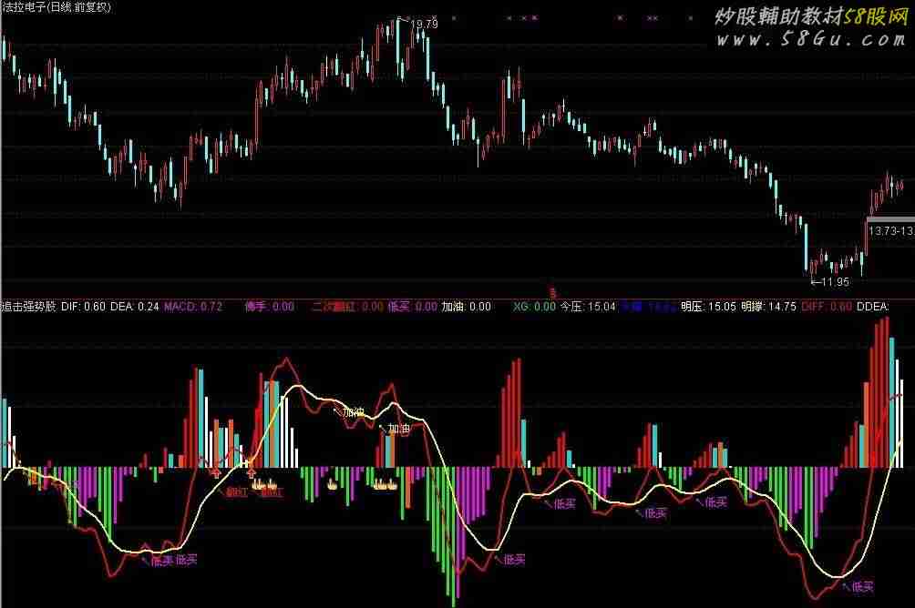 追击强势股 DIF:EMA(CLOSE,6)-EMA(CLOSE,19),,NODRAW; DEA:EMA(DIF,9),NODRAW; MACD:2*(DIF-DEA),COLORSTICK; STICKLINE(MACD>0,MACD,0,0.5,0),COLORRED; STICKLINE(MACD<0,MACD,0,0.5,0),COLORGREEN; STICKLINE(MACD>0 AND MACD<REF(MACD,1),MACD,0,0.5,0),COLORWHITE; STICKLINE(MACD<0 AND MACD>REF(MACD,1),MACD,0,0.5,0),COLORFF00FF; FH1:=REF(MACD,1)<REF(MACD,2) AND REF(MACD,2)<REF(MACD,3) AND REF(MACD,3)<REF(MACD,4); FH2:=MACD>=0 AND COUNT(MACD>REF(MACD,1),1)=1; FH3:=FH1 AND FH2 AND EMA(C,13)>REF(EMA(C,13),1); FH4:=FH1 AND FH2 AND ABS((DIF-DEA)/C)<0.018; FH5:=FH1 AND FH2 AND MACD<0.10; VV:=CLOSE>OPEN AND MA(CLOSE,5)>MA(CLOSE,10) AND MA(CLOSE,10)>MA(CLOSE,30) AND DIF>DEA AND MACD>REF(MACD,1) AND DIF>0 AND DEA>0 AND MA(VOL,5)>MA(VOL,34) AND MA(CLOSE,30)>=REF(MA(CLOSE,30),1); 佛手:IF(VV,1,0),NODRAW;{二次起动} X0:=BARSLAST((CROSS(MACD,REF(MACD,1)) AND MACD>0) OR CROSS(MACD,0)); X1:=BARSLAST(CROSS(0.5,COUNT(MACD>REF(MACD,1),X0+1)=X0+1));{回} X2:=COUNT(MACD<REF(MACD,1),X1+1)=X1+1 AND COUNT(MACD<0,X1+1)<=2; X3:=REF(X2,1) AND MACD>REF(MACD,1) AND C>O AND C>REF(C,1); STICKLINE(X1=0 AND MACD>0,MACD,0,2,0),COLORDCDC00;{MACD缩头} STICKLINE(X3,MACD,0,2,0),COLOR0854FF;{二次起动}; DRAWICON(佛手,-0.15,11); 二次翻红:(FH3 OR FH4 OR FH5),COLORRED,NODRAW; 低买:CROSS(DIF,DEA) AND DIF<0,COLORFF00FF,NODRAW; 加油:CROSS(DIF,DEA) AND DIF>0,COLORYELLOW,NODRAW; DRAWICON(二次翻红,-0.05,1); DRAWTEXT(二次翻红,-0.15,'↖翻红'),COLORRED; DRAWTEXT(CROSS(DIF,DEA) AND DIF<0,DEA-0.02,'↖低买'),COLORFF00FF; DRAWTEXT(CROSS(DIF,DEA) AND DIF>0,DEA-0.05,'↖加油'),COLORYELLOW; XG:二次翻红 OR 低买 OR 加油,NODRAW; YLZC:=IF(CLOSE=INDEXC,(INDEXC+INDEXH+INDEXL+INDEXO)/4,AMOUNT/(VOL+0.01)/100); 阻价:=IF(CLOSE=INDEXC,YLZC+INDEXC-INDEXL,YLZC+(CLOSE-LOW)); 支价:=IF(CLOSE=INDEXC,INDEXL+INDEXC-YLZC,LOW+(CLOSE-YLZC)); 今压:REF(阻价,1),LINETHICK0,COLORAA11BB,NODRAW; 今撑:REF(支价,1),LINETHICK0,COLOR009900,NODRAW; 明压:阻价,LINETHICK0,NODRAW; 明撑:支价,LINETHICK0,NODRAW; DIFF:DIF,COLORRED,LINETHICK2; DDEA:DEA,COLORYELLOW,LINETHICK2; |