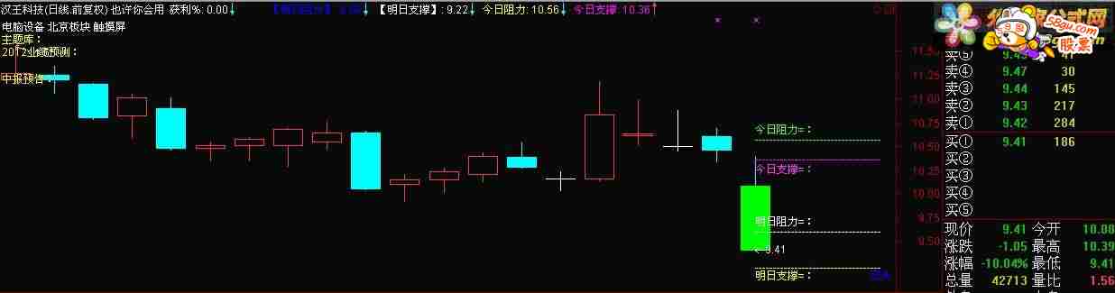 获利%:WINNER(CLOSE)*100,NODRAW,COLORWHITE; DRAWTEXT_FIX(获利%>=95 AND ISLASTBAR,0.97,0.97,0,'高危'),COLORRED; DRAWTEXT_FIX(获利%>=80 AND 获利%<95 AND ISLASTBAR,0.97,0.97,0,'风险'),COLORYELLOW; DRAWTEXT_FIX(获利%>=50 AND 获利%<80 AND ISLASTBAR,0.97,0.97,0,'安全'),COLORGREEN; DRAWTEXT_FIX(获利%<50 AND ISLASTBAR,0.97,0.97,0,'空头'),COLORBLUE; STICKLINE((C-REF(C,1))*100/REF(C,1)>=(10-0.01*100/REF(C,1)),OPEN,CLOSE,3,0),COLOR0055FF; STICKLINE((REF(C,1)-C)*100/REF(C,1)>=(10-0.01*100/REF(C,1)),OPEN,CLOSE,3,0),COLOR00FF00; DP:=IF(C=INDEXC,0,1); GJ:=AMOUNT/V/100; 【明日阻力】:L+(GJ-L)+(C-L),NODRAW; 【明日支撑】:L+(C-GJ),NODRAW; 今日阻力:REF(【明日阻力】 , 1),NODRAW; 今日支撑:REF(【明日支撑】 , 1),NODRAW; {STICKLINE(ISLASTBAR AND DP=1 AND C>=今日阻力,今日阻力,今日阻力,30,0),COLOR0000FF; STICKLINE(ISLASTBAR AND DP=1 AND C<今日阻力,今日阻力,今日阻力,30,0),COLOR00FF00; STICKLINE(ISLASTBAR AND DP=1 AND C>=今日支撑,今日支撑,今日支撑,30,0),COLORFF00FF; STICKLINE(ISLASTBAR AND DP=1 AND C<今日支撑,今日支撑,今日支撑,30,0),COLORFF0000;} {A:=ISLASTBAR; B:=ISLASTBAR; D:=A-B; E:=HHV(H,D);} DRAWTEXT(C>0 AND DP=1 AND ISLASTBAR,【明日支撑】,'-----------------------------------'),COLOR00FFFF; DRAWTEXT(C>0 AND DP=1 AND ISLASTBAR, 【明日阻力】,'-----------------------------------'),COLORFFFFFF; DRAWTEXT(C>0 AND DP=1 AND ISLASTBAR,今日支撑,'-----------------------------------'),COLORFF00FF; DRAWTEXT(C>0 AND DP=1 AND ISLASTBAR, 今日阻力,'-----------------------------------'),COLOR33FF33; DRAWTEXT(C>0 AND DP=1 AND ISLASTBAR AND 【明日阻力】, 【明日阻力】*1.01,'明日阻力=: '),COLORFFFFFF; DRAWTEXT(C>0 AND DP=1 AND ISLASTBAR AND 今日支撑, 今日支撑*0.99,'今日支撑=:'),COLORFF33FF; DRAWTEXT(C>0 AND DP=1 AND ISLASTBAR AND 【明日支撑】, 【明日支撑】*0.99,'明日支撑=:'),COLOR00FFFF; DRAWTEXT(C>0 AND DP=1 AND ISLASTBAR AND 今日阻力, 今日阻力*1.01,'今日阻力=:' ),COLOR33FF33; Z1:=STRCAT(HYBLOCK,' '); Z2:=STRCAT(Z1,DYBLOCK); Z3:=STRCAT(Z2,' '); DRAWTEXT_FIX(ISLASTBAR,0,0,0,STRCAT(Z3,GNBLOCK)); DRAWTEXT_FIX(C>0,0.001,0.050,0,'主题库:'),COLORYELLOW,LINETHICK2; DRAWTEXT_FIX(C>0,0.057,0.050,0,EXTERNSTR(0,2)),COLORRED,LINETHICK2; DRAWTEXT_FIX(C>0,0.001,0.098,0,'2012业绩预测:'),COLORYELLOW,LINETHICK2; DRAWTEXT_FIX(C>0,0.2,0.098,0,EXTERNSTR(0,4)),COLORRED,LINETHICK2; DRAWTEXT_FIX(C>0,0.001,0.2.0,0,'中报预告:'),COLORYELLOW,LINETHICK2; DRAWTEXT_FIX(C>0,0.080,0.2.0,0,EXTERNSTR(0,3)),COLORRED,LINETHICK2;
