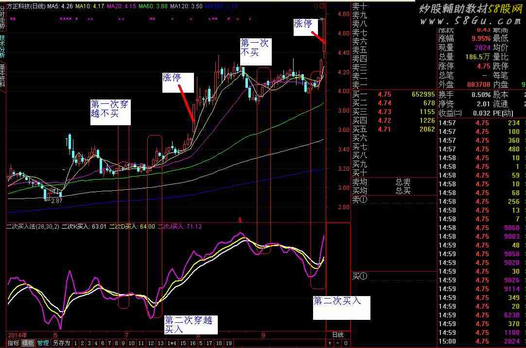 原理:第一次拉升是庄家吸筹盘整时期。一般不会有很大的升幅。而第二次拉升是庄家吸筹完成后真正希望股价大升吸引散户的方法。所以涨停的几率大增。