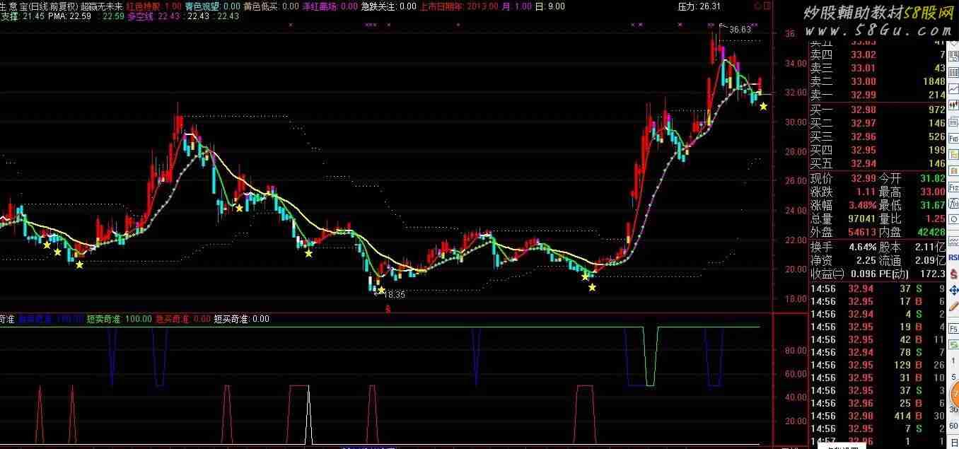 买点和卖点精确,适合做波段的幅图指标{买卖奇准}有了它炒股就好多了;你:=MA(CLOSE,1);老:=(LOW+HIGH+CLOSE)/3;板:= MA(老,5);好:= HHV(板,10);急卖奇准:IF(HHV((你<好),5),100,50),COLORBLUE;短卖奇准:IF(HHV((你<好),10),100,50),COLORGREEN;老板:= MA(老,5);买卖:=LLV(老板,10);急买奇准:IF(LLV((你<买卖),5),50,0),COLORRED;短买奇准:IF(LLV((你<买卖),10),50,0),COLORWHITE;R:=SUM(MAX(MAX((HIGH - LOW),ABS((HIGH - REF(CLOSE,1)))),ABS((LOW - REF(CLOSE,1)))),5);HD:=(HIGH - REF(HIGH,1));LD:=(REF(LOW,1) - LOW);DMP:=(SUM(IF(((HD > 0) AND (HD > LD)),HD,0),5) );DMM:=SUM(IF(((LD > 0) AND (LD > HD)),LD,0),5); |