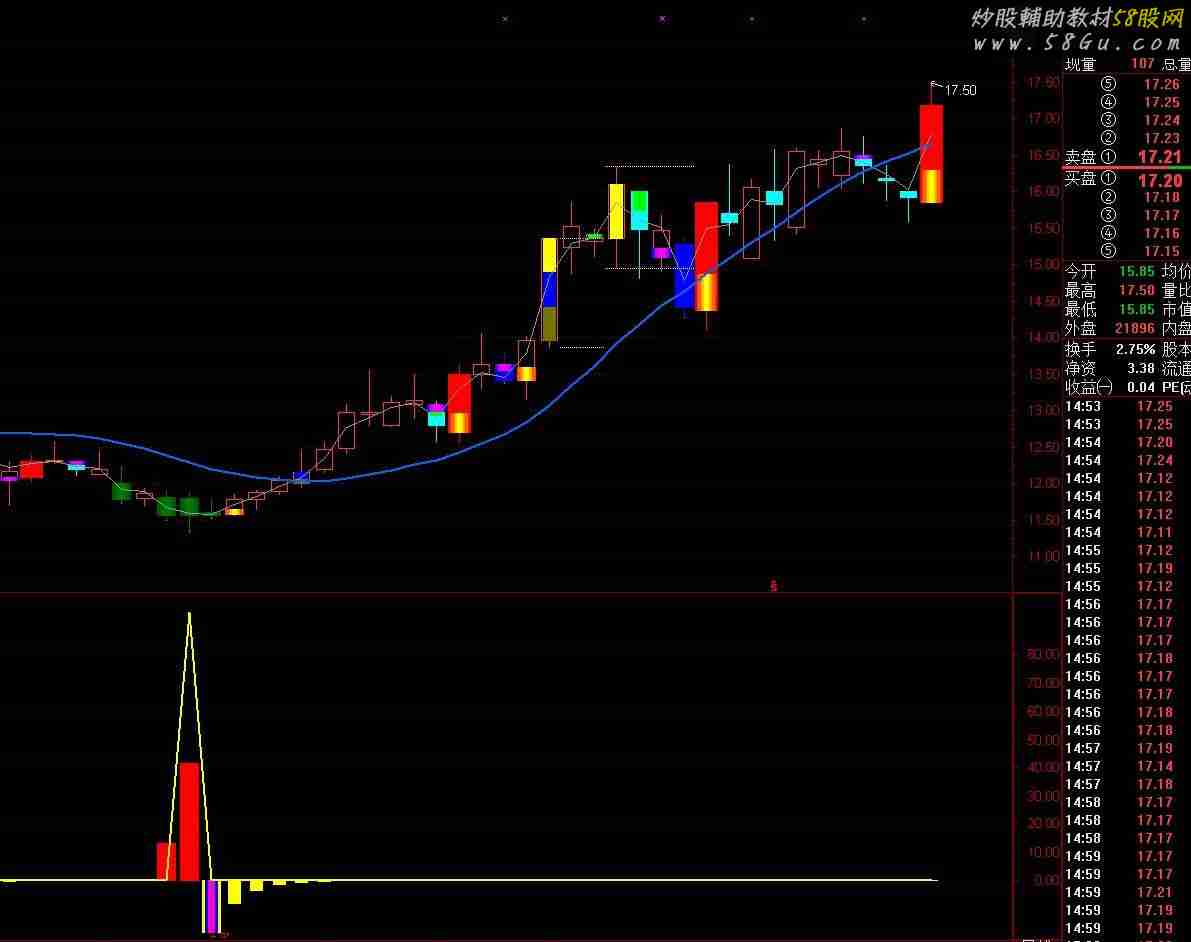 VAR1:=XMA(REF((L+OPEN+CLOSE+HIGH)/4,1),2); VAR2:=SMA(ABS(LOW-VAR1),11,1)/SMA(MAX(LOW-VAR1,0),11,1); VAR3:=EMA(VAR2,3); VAR4:=LLV(LOW,11); VAR5:=EMA(IF(LOW<=VAR4,VAR3,0),5.5); AA:=IF(VAR5>REF(VAR5,1),VAR5,0),COLORMAGENTA,NODRAW; AA1:=IF(VAR5<REF(VAR5,1),VAR5,0),COLORGREEN,NODRAW; AA2:EXPMEMA(AA+AA1,1),COLORRED,NODRAW; AA3:=EXPMEMA(AA-AA1,1); 筹码:=EXPMEMA(AA2*AA3,1); STICKLINE(筹码>REF(筹码,1)AND 筹码>0,0,筹码,3,0),COLORRED; STICKLINE(筹码>REF(筹码,1)AND 筹码>0,0,筹码,2,0),COLORRED; STICKLINE(筹码>REF(筹码,1)AND 筹码>0,0,筹码,1.5,0),COLORRED; STICKLINE(筹码>REF(筹码,1)AND 筹码>0,0,筹码,0.5,0),COLORRED; STICKLINE(筹码>REF(筹码,1)AND 筹码<0,0,筹码,2,0)COLORYELLOW; STICKLINE(筹码<REF(筹码,1)AND 筹码<0,0,筹码,3,0),COLORYELLOW; STICKLINE(筹码<REF(筹码,1)AND 筹码<0,0,筹码,3,0),COLORYELLOW; STICKLINE(筹码<REF(筹码,1)AND 筹码<0,0,筹码,2,0),COLORBLUE; STICKLINE(筹码<REF(筹码,1)AND 筹码<0,0,筹码,1,0),COLORCC00FF; DRAWTEXT(CROSS(0,筹码),筹码,'*买'),COLORRED;RSV:=(((CLOSE - LLV(LOW,9)) / (HHV(HIGH,9) - LLV(LOW,9))) * 100); K:=SMA(RSV,3,1); D:=SMA(K,3,1); J:=3*K-2*D; X:=LLV(J,2)=LLV(J,8); 注意: IF(CROSS(J,3),95,0),COLORYELLOW,LINETHICK2;
