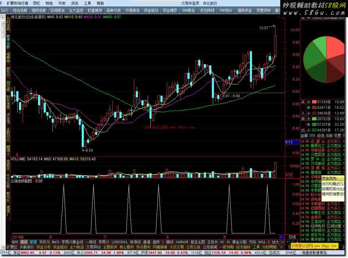 VAR1:=(CLOSE-LLV(LOW,80))/(HHV(HIGH,80)-LLV(LOW,80))*200; VAR2:=SMA(VAR1,3,1); VAR3:=SMA(VAR2,3,1); VAR4:=3*VAR2-2*VAR3; VAR5:=LLV(LOW,5); VAR6:=HHV(HIGH,5); VAR7:=EMA((CLOSE-VAR5)/(VAR6-VAR5)*100,4)*2; VAR8:=EMA(0.667*REF(VAR7,1)+0.333*VAR7,2); VAR9:=3*VAR7-2*VAR8; VARA:=POW(MA(CLOSE,5),2)+MA(CLOSE,5); VARB:=POW(MA(LOW,5),2)+MA(LOW,5); VARC:=POW(MA(HIGH,5),2)+MA(HIGH,5); VARD:=(VARA-LLV(VARB,64))/(HHV(VARC,64)-LLV(VARB,64))*150+65-10; VARE:=SMA(VARD,3,1)*1.5-100; VARF:=SMA(VARE,3,1); VAR10:=3*VARE-2*VARF; VAR11:=(HIGH+LOW+CLOSE*2)/4; VAR12:=EMA(VAR11,13); VAR13:=STD(VAR11,13); VAR14:=(VAR11-VAR12)*100/VAR13; VAR15:=EMA(VAR14,5); VAR17:=EMA(VAR15,13)+200-100; VAR18:=EMA(VAR17,10); VAR19:=3*VAR17-2*VAR18; VAR1A:=VAR2+VAR7+VARE+VAR17; VAR1B:=VAR3+VAR8+VARF+VAR18; VAR1C:=VAR4+VAR9+VAR10+VAR19; VAR1D:=(HIGH+LOW+CLOSE)/3; VAR20:=(VAR1D-MA(VAR1D,34))/(0.015*AVEDEV(VAR1D,34)); VAR21:=DMA(AMOUNT/VOL/100,VOL/CAPITAL); VAR22:=(HIGH+LOW+CLOSE+VAR1D)/4; VAR23:=EMA(VAR22,24); VAR24:=STD(VAR22,24); VAR25:=(VAR22-VAR23)/VAR24*100; VAR26:=(VAR1D-MA(VAR1D,24))/(0.015*AVEDEV(VAR1D,24)); VAR27:=EMA(VAR25,5); VAR2A:=((VAR27+VAR26+VAR20)/3+165)/4; VAR2C:=(VAR1A+VAR1B+VAR1C*30)/32/5-15; VAR2E:=(VAR2A+VAR2C)/2/1.1; 短线准备:=EMA(VAR2E,3); 波段准备:=EMA(短线准备,5); CROSS(短线准备,波段准备);  |