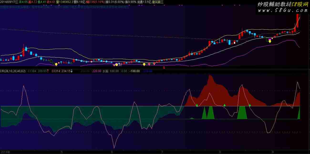cci84翻红,代表股票即将进入主升浪DRAWGBK(C>0,RGB(20,10,80),RGB(10,1,5),1,0,1);{CCI}TYP:=(HIGH+LOW+CLOSE)/3;CCI84:(TYP-MA(TYP,84))/(0.015*AVEDEV(TYP,84)),COLORLICYAN;DRAWBAND(100,RGB(0,50,50),CCI84,RGB(100,10,0));CCI14:(TYP-MA(TYP,14))/(0.015*AVEDEV(TYP,14)),COLORLIRED;{短线精灵}主力资金线:=((CLOSE-MA(CLOSE,6))/MA(CLOSE,6)*100+(CLOSE-MA(CLOSE,24))/MA(CLOSE,24)*100+(CLOSE-MA(CLOSE,32))/MA(CLOSE,32)*100)/3;VAR2LL:=HHV(主力资金线>20,10); STICKLINE(VAR2LL AND CROSS((REF(HIGH,1)+REF(LOW,1))/2,MA(CLOSE,20)+2*STD(CLOSE,20)),CCI14,100,1,0),COLORBROWN; {危险:};VAR1T:=MA(100*(CLOSE-LLV(CLOSE,34))/(HHV(HIGH,34)-LLV(LOW,34)),5)-20;VAR2T:=2*ABS(VAR1T);VAR5T:=(HIGH+LOW+CLOSE)/3;VAR6T:=(VAR5T-MA(VAR5T,14))/(0.015*AVEDEV(VAR5T,14));VAR7T:=(VAR5T-MA(VAR5T,70))/(0.015*AVEDEV(VAR5T,70));VAR8T:=IF(VAR6T>=150 AND VAR6T<200 AND VAR7T>=150 AND VAR7T<200,10,0);VAR9T:=IF(VAR6T<=-150 AND VAR6T>-200 AND VAR7T<=-150 AND VAR7T>-200,-10,VAR8T);VARAT:=(CLOSE-MA(CLOSE,13))/MA(CLOSE,13)*100;VARBT:=100-ABS(VARAT);预警系统:=IF(VAR7T>=200 AND VAR6T>=150,100,IF(VAR7T<=-200 AND VAR6T<=-150,-100,VAR9T))+0;DRAWBAND(预警系统,RGB(10,100,10),0,RGB(100,10,0));天线:=IF(VARBT<90,VARBT,60);红军:=IF(VAR1T>0,VAR1T,0),COLORRED, LINESTICK;VAR24:=红军>48 AND 预警系统>60 AND 天线<100;DRAWICON(COUNT(CROSS(2,预警系统),15)>=1 AND CROSS(100,CCI14),100,2);DRAWICON(COUNT(CROSS(预警系统,-2),15)>=1 AND CROSS(CCI14,0),-100,1);350,COLOR004400,POINTDOT;220,COLORMAGENTA,POINTDOT;水面:100,COLORGRAY;0,COLORLICYAN,POINTDOT;-100,POINTDOT,COLORYELLOW;-220,COLORBLUE,POINTDOT; |