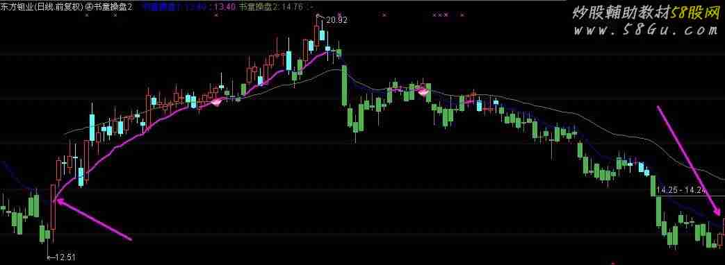 STICKLINE(MACD.MACD<0,C,O,3,0),COLORLIGREEN; STICKLINE(MACD.MACD<0,L,H,0,0),COLORGRAY; 书童操盘1:(MA(CLOSE,3)+MA(CLOSE,6)+MA(CLOSE,12)+MA(CLOSE,24))/4,LINETHICK1,COLORBLUE; IF(书童操盘1>REF(书童操盘1,1),书童操盘1,DRAWNULL),LINETHICK2,COLORMAGENTA; 书童操盘2:(MA(CLOSE,6)+MA(CLOSE,18)+MA(CLOSE,54)+MA(CLOSE,162))/4,COLORBROWN; IF(书童操盘2>REF(书童操盘2,1),书童操盘2,DRAWNULL),COLORBROWN; DRAWICON(CROSS(书童操盘1,书童操盘2),(LOW * 0.99),25);