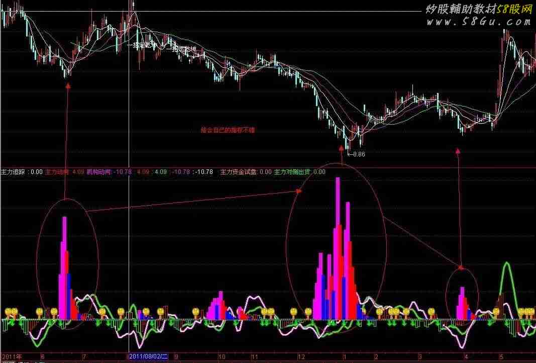 V1:=(C*3+H+L)/5*10; V2:=EMA(V1,13)-EMA(V1,34); V3:=EMA(V2,5); V4:=2*(V2-V3)*5.5; V5:=(HHV(INDEXH,8)-INDEXC)/(HHV(INDEXH,8)-LLV(INDEXL,8))*8; V6:=EMA(3*V5-2*SMA(V5,18,1),5); V7:=(INDEXC-LLV(INDEXL,8))/(HHV(INDEXH,8)-LLV(INDEXL,8))*10; V8:=(INDEXC*2+INDEXH+INDEXL)/4; V9:=EMA(V8,13)-EMA(V8,34); VA:=EMA(V9,3); VB:=(V9-VA)/2; 0; 主力动向:EMA(V4,2),COLORRED; 机构动向:EMA(VB,2),COLORMAGENTA; (SLOPE(主力动向,2)>0 AND SLOPE(机构动向,2)>0,主力动向),COLORRED,LINETHICK4; (SLOPE(主力动向,2)<0,主力动向),COLORGREEN,LINETHICK3; (SLOPE(机构动向,2)>0 AND SLOPE(主力动向,2)>0,机构动向),COLORMAGENTA,LINETHICK4; (SLOPE(机构动向,2)<0,机构动向),COLORWHITE,LINETHICK2; ZLCM:=EMA(WINNER(CLOSE)*70,3); SHCM:=EMA((WINNER(CLOSE*1.1)-WINNER(CLOSE*0.9))*80,3); ZZLKP:=ZLCM/(ZLCM+SHCM)*100; ZZLJJ:=EMA(ZZLKP,89); ZJLRQD:=ZZLKP-ZZLJJ; AA:=EMA(ZJLRQD,1); BB:=EMA(AA,5); CC:=AA-BB; STICKLINE(CC<REF(CC,2),CC,0,5,1), COLOR00FF00; STICKLINE(CC>REF(CC,2),CC,0,5,1), COLORRED; 主力资金试盘:IF(CROSS(AA,BB),3,0),STICK,LINETHICK4,COLOR0080FF; 主力对倒出货:IF(CROSS(BB,AA),-3,0),STICK,LINETHICK4,COLOR00FF00; DRAWICON(主力资金试盘>0,5,4); DRAWICON(主力对倒出货<0,-4,2); VAR1:=REF((LOW+OPEN+CLOSE+HIGH)/4,1); VAR2:=SMA(ABS(LOW-VAR1),13,1)/SMA(MAX(LOW-VAR1,0),10,1); VAR3:=EMA(VAR2,10); VAR4:=LLV(LOW,33); VAR5:=EMA(IF(LOW<=VAR4,VAR3,0),5); 惨跌:STICKLINE(VAR5>REF(VAR5,1),0,VAR5,7,0 ),COLORMAGENTA; 主力拉升:STICKLINE(VAR5<REF(VAR5,1),0,VAR5,7,0),COLORRED;{红} 洗盘阴:STICKLINE(VAR5<REF(VAR5,1) AND C<O,0,VAR5,7,0),COLORBLUE;