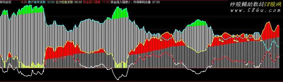 ZLCM:=EMA(WINNER(CLOSE)*70,3);{//主力筹码估算} SHCM:=EMA((WINNER(CLOSE*1.1)-WINNER(CLOSE*0.9))*80,3);{//散户筹码估算} ZSHTL:=SHCM/(ZLCM+SHCM)*100;{//散户套牢筹码比率} ZZLKP:=ZLCM/(ZLCM+SHCM)*100;{//主力控盘筹码比率} ZCMZL:=MA(ZLCM+SHCM,13);{//市场筹码总量} ZZNTS:=BARSLAST(ZSHTL<90 AND REF(ZSHTL,1)>90);{//走牛天数} ZSHJJ:=EMA(ZSHTL,89);{//散户警戒} ZZLJJ:=EMA(ZZLKP,89);{//主力警戒} ZJLRQD:=INTPART(ZZLKP-ZZLJJ);{//资金流入强度} SH8:=EMA(ZSHTL,8); DKB:=IF(ZZLKP-REF(ZZLKP,1)>ZSHTL-REF(ZSHTL,1),1,0); {散户套牢筹码} STICKLINE(C>0,ZSHTL,ZZLKP,1,0),COLORFFFFFF; {散户筹码警戒} STICKLINE(ZSHJJ>REF(ZSHJJ,1),ZSHTL,ZSHJJ,2,0),COLOR00FF00; {主力控盘筹码} STICKLINE(C>0,ZZLKP,0,1,0),COLORA4A4A4; {筑顶风险区} STICKLINE(ZZLKP>75,ZZLKP,0,1,0),COLORFFFFFF; {顶部:(ZZLKP>75),COLORFFFFFF;} {主力筹码警戒} STICKLINE(ZZLJJ>REF(ZZLJJ,1),ZZLKP,ZZLJJ,2,0),COLORRED; {筑底散兵坑} STICKLINE(ZSHTL>=90,ZZLKP,0,2,0),COLOR66FFCC; {底部:(ZSHTL>=90),COLOR66FFCC;} {筹码总量上升} IF(ZCMZL,ZCMZL>REF(ZCMZL,1),DRAWNULL),COLOR0066FF,LINETHICK1; {增量资金}; {//------【数值显示】} 散户套牢系数:INTPART(ZSHTL),COLORCYAN,LINETHICK2; 主力控盘系数:INTPART(ZZLKP),COLORYELLOW,LINETHICK2; 资金流入强度:ZJLRQD,LINETHICK2,COLORRED; 资金流入强度2:IF(ZJLRQD<10,ZJLRQD,DRAWNULL),LINETHICK2,COLORWHITE; 市场筹码总量:INTPART(ZCMZL),COLORWHITE,NODRAW; DRAWICON(CROSS(主力控盘系数,散户套牢系数),散户套牢系数-5,11); DRAWICON(CROSS(资金流入强度,散户套牢系数),散户套牢系数-5,17);