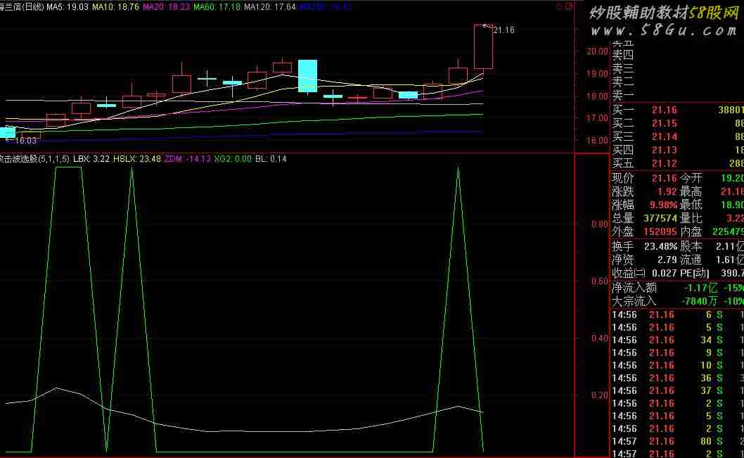 用法,五线顺上出信号有效,其他无效。LBX:V/REF(MA(V,5),1),NODRAW;HSLX:VOL/FINANCE(7)*10000,NODRAW; ZDM:(ACTINVOL-ACTOUTVOL)/VOL*100,NODRAW;XG2:LBX>1.5 AND HSLX>2 AND ZDM>10;BL:LBX/HSLX;