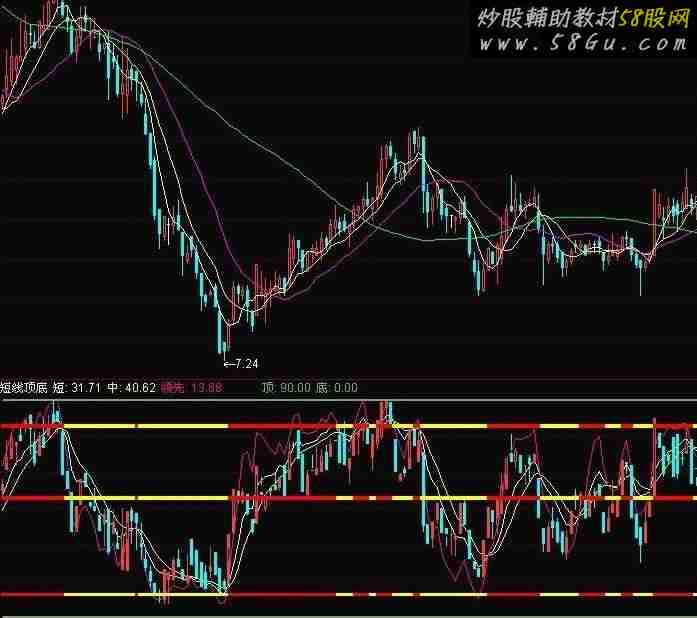 用法:很简单,红线上传底线买入,下穿顶线卖出。VAR1:=SMA(MAX(OPEN-REF(OPEN,1),0),6,1)/SMA(ABS(OPEN-REF(OPEN,1)),6,1)*100; VAR2:=SMA(MAX(CLOSE- REF(CLOSE,1),0),6,1)/SMA(ABS(CLOSE- REF(CLOSE,1)),6,1)*100; VAR3:=SMA(MAX(HIGH-REF(HIGH,1),0),6,1)/SMA(ABS(HIGH-REF(HIGH,1)),6,1)*100; VAR4:=SMA(MAX(LOW- REF(LOW,1),0),6,1)/SMA(ABS(LOW- REF(LOW,1)),6,1)*100; VAR5:=(CLOSE-LLV(LOW,9))/(HHV(HIGH,9)-LLV(LOW,9))*100; 短:SMA(VAR5,6,1),COLORWHITE; 中:SMA(短,3,1),COLORYELLOW; 领先:3*短-2*中,COLORLIMAGENTA; DRAWKLINE(VAR3,VAR1,VAR4,VAR2); STICKLINE(短>0 AND 短-中>=0,79,80,6,0),COLORRED; STICKLINE(短>0 AND 短-中<0,79,80,6,0),COLORYELLOW; STICKLINE(短>0 AND 短-中>=0,49,50,6,0),COLORRED; STICKLINE(短>0 AND 短-中<0,49,50,6,0),COLORYELLOW; STICKLINE(短>0 AND 短-中>=0,9,10,6,0),COLORRED; STICKLINE(短>0 AND 短-中<0,9,10,6,0), COLORYELLOW; 顶:90, LINETHICK2 ,COLOR55AA77; 底:0, LINETHICK2 ,COLOR55AA77; |