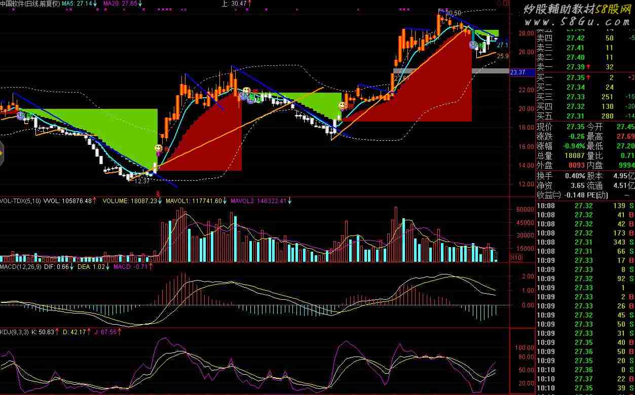 {全新多空线} MID:=(3*CLOSE+LOW+OPEN+HIGH)/3; 多空买卖线:(10*MID+9.5*REF(MID,0.5)+9*REF(MID,1)+8.5*REF(MID,1.5)+ 8*REF(MID,2)+7.5*REF(MID,2.5)+7*REF(MID,3)+ 6.5*REF(MID,3.5)+6*REF(MID,4)+5.5*REF(MID,4.5)+ 5*REF(MID,5)+4.5*REF(MID,5.5)+4*REF(MID,6)+ 3.5*REF(MID,6.5)+3*REF(MID,7)+2.5*REF(MID,7.5)+ 2*REF(MID,8)+1.5*REF(MID,8.5)+1*REF(MID,9)+0.5*REF(MID,10))/210,COLORCYAN,LINETHICK2; DD:=MA(多空买卖线,3),COLORCYAN,LINETHICK2; DRAWNUMBER(ISLASTBAR,多空买卖线,多空买卖线),COLORCYAN;MIDS:=(3*CLOSE+LOW+OPEN+HIGH)/6; 多空线:(20*MIDS+19*REF(MIDS,1)+18*REF(MIDS,2)+17*REF(MIDS,3)+ 16*REF(MIDS,4)+15*REF(MIDS,5)+14*REF(MIDS,6)+ 13*REF(MIDS,7)+12*REF(MIDS,8)+11*REF(MIDS,9)+ 10*REF(MIDS,10)+9*REF(MIDS,11)+8*REF(MIDS,12)+ 7*REF(MIDS,13)+6*REF(MIDS,14)+5*REF(MIDS,15)+ 4*REF(MIDS,16)+3*REF(MIDS,17)+2*REF(MIDS,18)+REF(MIDS,20))/210,COLORMAGENTA;{********************************************************};高1:=REF(HHV(H,120),3); 低1:=REF(LLV(L,120),3); H1:=高1-(高1-低1)*0.191; H2:=高1-(高1-低1)*0.382; H3:=高1-(高1-低1)*0.5; H4:=高1-(高1-低1)*0.618; H5:=高1-(高1-低1)*0.809; 突破:=多空线; A1X:=(EMA(C,5)-突破)/突破*100; 基准:=IF(A1X>=0,REF(EMA(C,10),BARSLAST(CROSS(A1X,0))+1),REF(EMA(C,10),BARSLAST(CROSS(0,A1X))+1)); STICKLINE(A1X>=0,基准,突破,5,0),COLOR000099; STICKLINE(A1X<0,基准,突破,5,0),COLOR00CC66; AA:=CROSS(A1X,0),LINETHICK0; STICKLINE(A1X>=0,C,O,2.7,0),COLOR0011FF; STICKLINE(A1X>=0,C,O,1.8,0),COLOR0044FF; STICKLINE(A1X>=0,C,O,0.9,0),COLOR0077FF; STICKLINE(A1X>=0,C,O,0.1,0),COLOR0099FF; STICKLINE(A1X>=0,H,L,0,0),COLOR0099FF; STICKLINE(AA,C,O,2.7,0),COLOR330033; STICKLINE(AA,C,O,1.8,0),COLOR770077; STICKLINE(AA,C,O,0.9,0),COLORBB00BB; STICKLINE(AA,C,O,0.1,0),COLORFF00FF; STICKLINE(AA,H,L,0,0),COLORFF00FF; DRAWICON(AA,C*0.9992,5); DRAWTEXT(AA,C*0.998,'上楼'),COLORRED; BB:=CROSS(0,A1X),LINETHICK0; STICKLINE(A1X<0,C,O,2.7,0),COLORAAAAAA; STICKLINE(A1X<0,C,O,1.8,0),COLORCCCCCC; STICKLINE(A1X<0,C,O,0.9,0),COLORDDDDDD; STICKLINE(A1X<0,C,O,0.1,0),COLORFFFFFF; STICKLINE(A1X<0,H,L,0,0),COLORFFFFFF; STICKLINE(BB,C,O,2.7,0),COLOR333300; STICKLINE(BB,C,O,1.8,0),COLOR555500; STICKLINE(BB,C,O,0.9,0),COLOR777700; STICKLINE(BB,C,O,0.1,0),COLOR999900; STICKLINE(BB,H,L,0,0),COLOR999900; DRAWICON(BB,C*1.0005,6); DRAWTEXT(BB,C*1.001,'下楼'),COLOR00FF00;{********************************************************}; 下降压力线:DRAWLINE(HIGH>=HHV(HIGH,10),HIGH,LOW<=LLV(LOW,3),HHV(HIGH,3),1),COLORBLUE,LINETHICK2; 上升支撑线:DRAWLINE(LOW<=LLV(LOW,10),LOW,HIGH>=HHV(HIGH,3),LLV(LOW,3),1),COLOR0099FF ,LINETHICK2; DRAWNUMBER(ISLASTBAR,下降压力线,下降压力线),COLORBLUE; DRAWNUMBER(ISLASTBAR,上升支撑线,上升支撑线),COLOR0099FF; 上:WMA(SMA(HHV(HIGH,18),9/2,1),3), COLORFAABEC,DOTLINE; 下:WMA(SMA(LLV(LOW,18),9/2,1),3),COLORWHITE,DOTLINE;