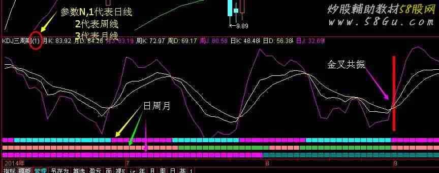 看图应该明白怎么用了,参数N为1时显示日线级别的kdj,N为2时显示周线级别的KDJ,N为3时显示月线级别的KDJ,是在日线级别中看的.