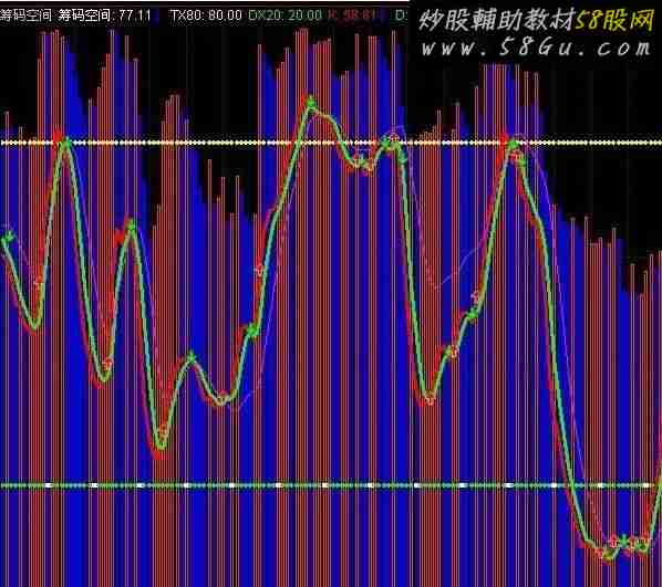 筹码空间:IF(WINNER(CLOSE),WINNER(CLOSE)*100,20),VOLSTICK; TX80:80,POINTDOT COLORYELLOW,LINETHICK4; DX20:20,POINTDOT COLORGREEN,LINETHICK4; VAR1:=LLV(LOW,21); VAR2:=HHV(HIGH,21); K: EMA((CLOSE-VAR1)/(VAR2-VAR1)*100,6),COLORRED,LINETHICK3; D: EMA(0.667*REF(K,1)+0.333*K,2),COLORGREEN,LINETHICK3; VAR3:=LLV(LOW,55); VAR4:=HHV(HIGH,34); VAR5:=EMA((CLOSE-VAR3)/(VAR4-VAR3)*100,3); VAR6:=(K+VAR5)/2; VAR7:=EMA(0.667*REF(VAR5,1)+0.333*K,2); VAR8:=EMA(VAR6,5); VAR9:EMA(0.667*REF(VAR8,1)+0.333*VAR8,2); DRAWICON(LONGCROSS(D,K,0.1),D,2),COLORRED,LINETHICK3; DRAWICON(LONGCROSS(K,D,0.1),K,1),COLORGREEN,LINETHICK3;