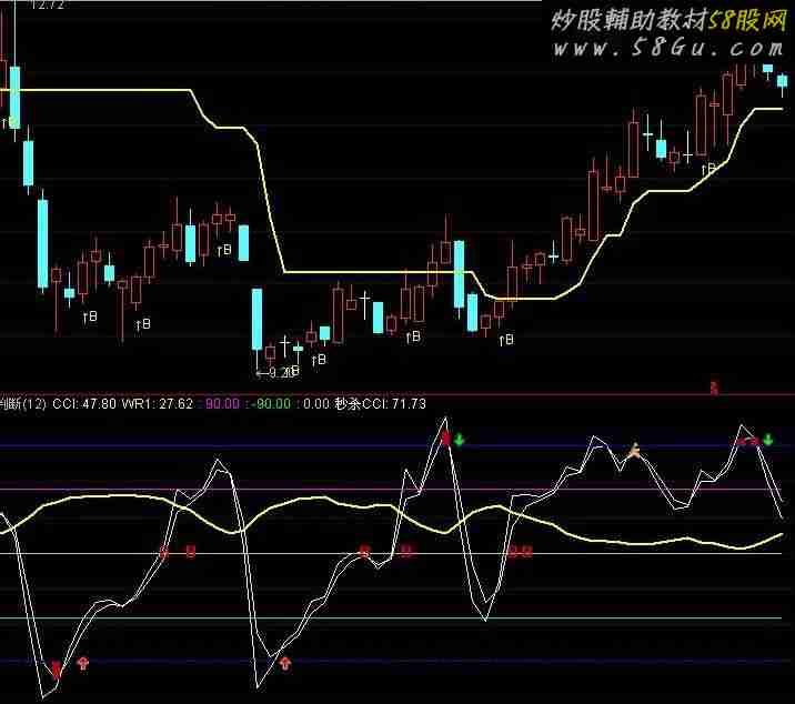 使用说明: 1、底部出现红柱不立即介入,待出现红箭头时再买进; 2、出现B点,开始转强,可适当加仓; 3、出现快走信号时,表示1-3天内股价见顶,如顶部红柱+快走信号,或者顶部红柱+绿箭头要减仓止损; 4、一般CCI上穿WR,并且CCI在WR上方运行,表示该支股票为强势股。 5、设定参数N(1,100,12),同学们也可根据需要自行设定。TYP:=(HIGH+LOW+CLOSE)/3; CCI:(TYP-MA(TYP,N))/(0.015*AVEDEV(TYP,N)); WR1:EMA(100*(HHV(HIGH,N)-CLOSE)/(HHV(HIGH,N)-LLV(LOW,N)),5),LINETHICK2; 90; -90; 0; {秒杀CCI} 秒杀CCI:EMA((TYP-MA(TYP,N))/(0.015*AVEDEV(TYP,N)),2.0332),COLORWHITE; STICKLINE(秒杀CCI<-150,秒杀CCI,-150,2,0),COLOR0000BB; STICKLINE(C>0,-150,-151,2,0),COLORBLUE; STICKLINE(秒杀CCI>150,秒杀CCI,150,2,0),COLOR0000BB; STICKLINE(C>0,150,151,6,0),COLORBLUE; DRAWICON(CROSS(CCI,0) OR CROSS(秒杀CCI,WR1),0,7); DRAWICON(CROSS(CCI,秒杀CCI) AND 秒杀CCI>100 ,秒杀CCI,15); DRAWICON(CROSS(CCI,-130) ,-153,1); DRAWICON(CROSS(153,秒杀CCI),153,2); |